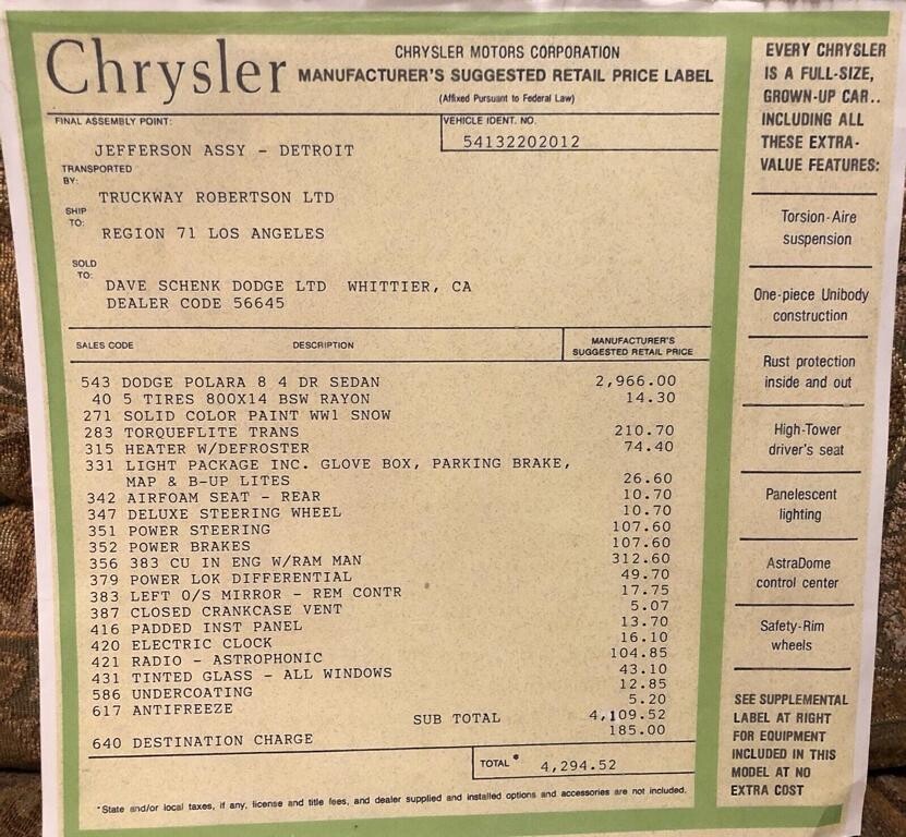 Interesting car, looking at the build sheet it seems as it was ordered to be a sleeper ,plain white and dog dish hubcaps, but it does have a lot of interior options, as well as the engine