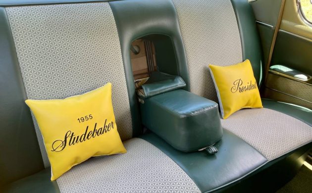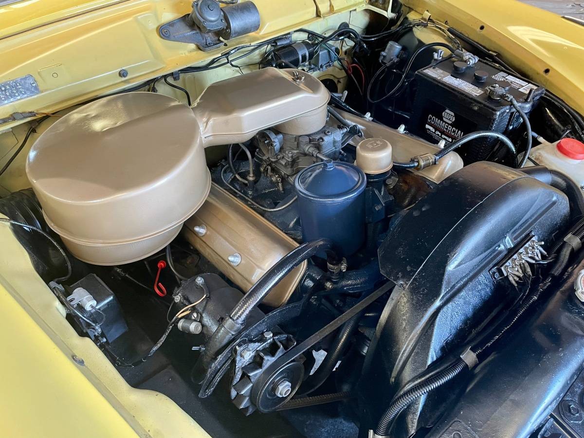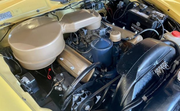 We’re told this “Prez” has just 60,000 or so miles and the 259 cubic inch V8 and 3-speed manual transmission are original to the machine. It’s said to run and drive flawlessly and has newer parts, including the battery, voltage regulator, and generator. We suspect that the paint is a redo and older but in the original white over yellow colors. The interior is from the factory and looks both flawless and comfortable.