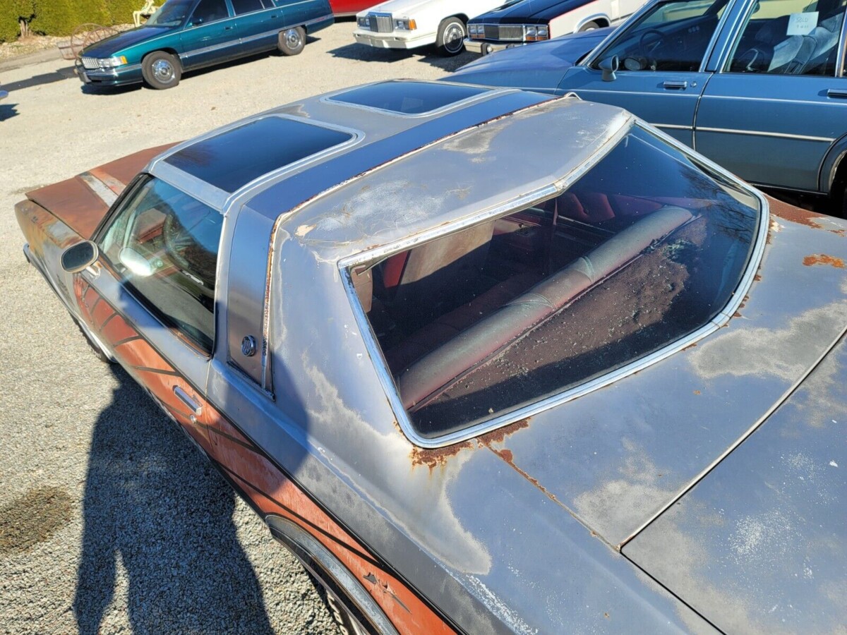 The rust doesn’t stop at the surface, either, with bad spots appearing at the base of the rear window and lower fenders. But what’s this we see up top? It’s the optional (not all replicas had them) “Hurst Hatch” T-top roof and a brushed aluminum or stainless (sources differ) basket handle applique, possibly to hide the massive blind spots in the Century’s hardtop design.