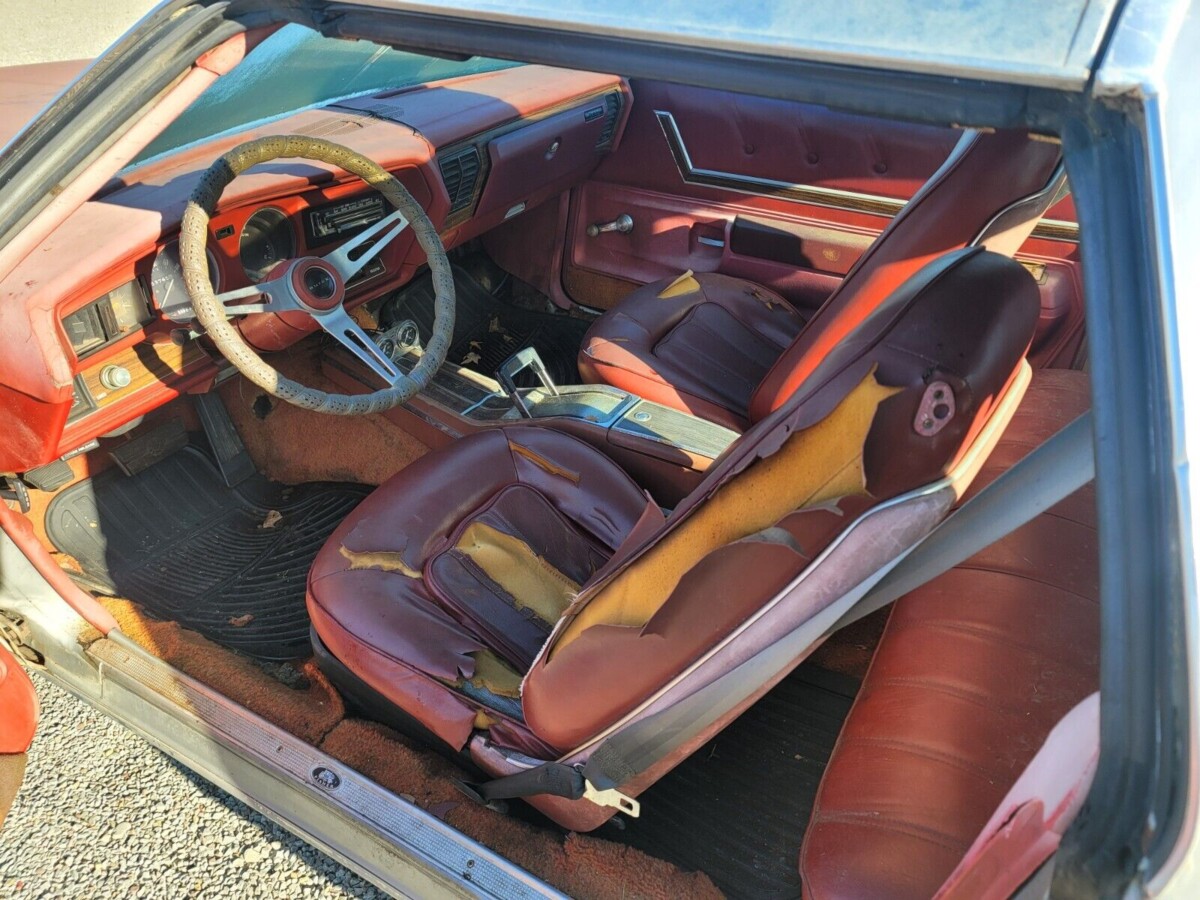 The car came new with a 350 as shown by the VIN in the eBay auction. However, this could be a 455 that someone added later. Pictures aren’t quite good enough to be certain, plus someone has removed half the A/C equipment. This is a Hurst Hatch that never had the recall done. It still has the glass panels with the surround chrome. Leaked like Niagra Falls. The car has been road hard and put up wet a few times too many. Would make a great parts car if you could find a clean low mile Century Special but not sure this one is worth trying to put back on the road.