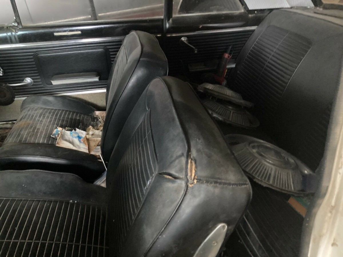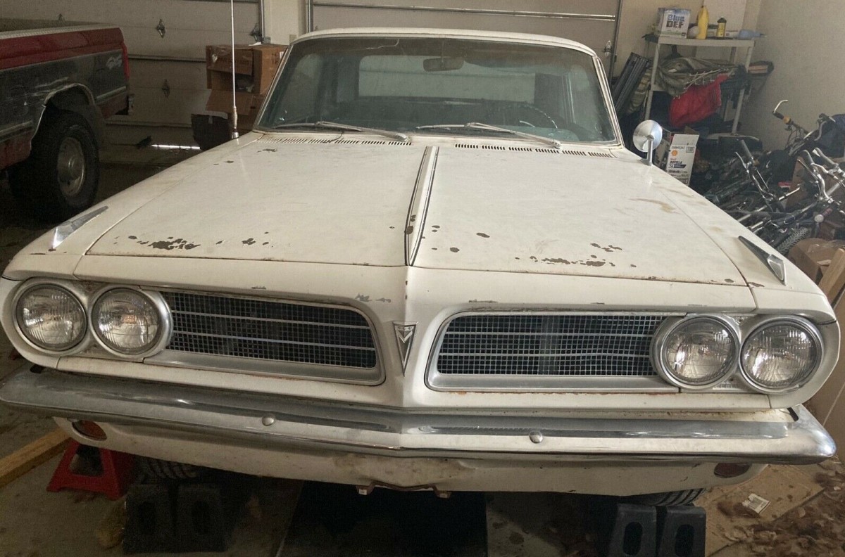 How the seller came to have this car is unknown, as well as the rest of its history. We assume the 421 is under the hood, but the photos don’t show a lot of detail. We’re told the interior resembles that of a Corvette, but the seller is mistaken. Looks more like a Corvair inside to me and the interior is in okay condition but could use a restoration. What we see of the body mostly displays surface rust. All the SD Tempests were painted white with blue interiors.