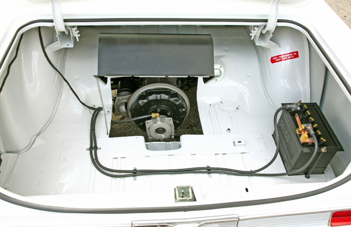 The quirkiness of the Tempest included its use of a ¾ inch flexible-steel driveshaft that connected the crankshaft in Pontiac’s standard big 4-cylinder engine (essentially half of a 389 V-8) to the rear-mounted transaxle, running in a curved “torque tube.” The setup allowed a flat floor inside the car. Since all the Pontiac’s V8 blocks were the same size, a 421 would work there as well. Pontiac built a 4-speed version of the Tempest’s 2-speed automatic transmission for the job, called the PowerShift, which replaced the torque converter with a hydraulic clutch on the tail end. The clutch was used to engage first and reverse, and the driver manually shifted into second through fourth. To make room for the longer tranny, the fuel tank was cut in half and the battery was moved to the trunk for the 14.