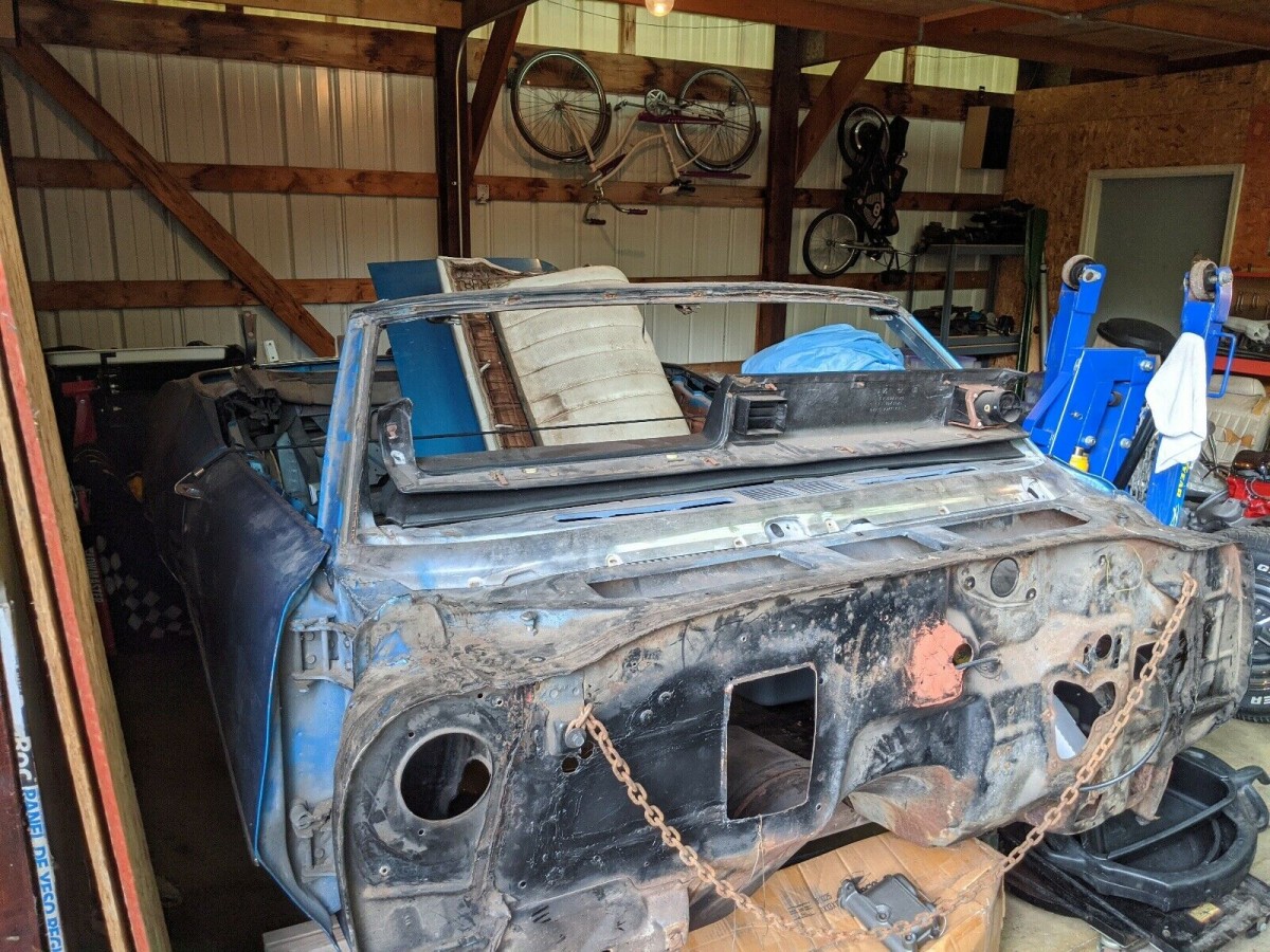The sheet metal, in its various states, is finished in Stratomist Blue, which we assume was the original color. The car doesn’t appear to have been repainted yet, but what’s there doesn’t look bad. The GS is said to have come with a white bench seat interior, but we don’t see any of those pieces in the photos, so we don’t know if the buyer will be receiving those components or not. The seller doesn’t say whether the car is complete, instead mentioning he “has most parts with a lot of new parts to go with it.”