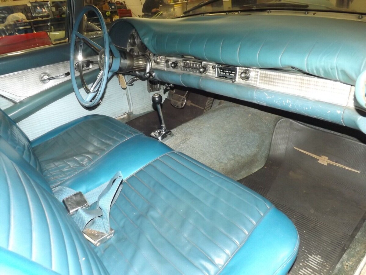 shows an F paint code which is the Starmist Blue that it is wearing…Also I wonder if the Yblock was completely replaced or if the 2×4 teapot Holleys and manifold were taken off…they could be something of a fire hazard the way the bowl sits… either way it’s kind of sad— very rare-I’ve got an E-code in my 57 Custom 300 2dr…It’s a super strong engine- it was really a beast in the Thunderbird. Good article Russ!