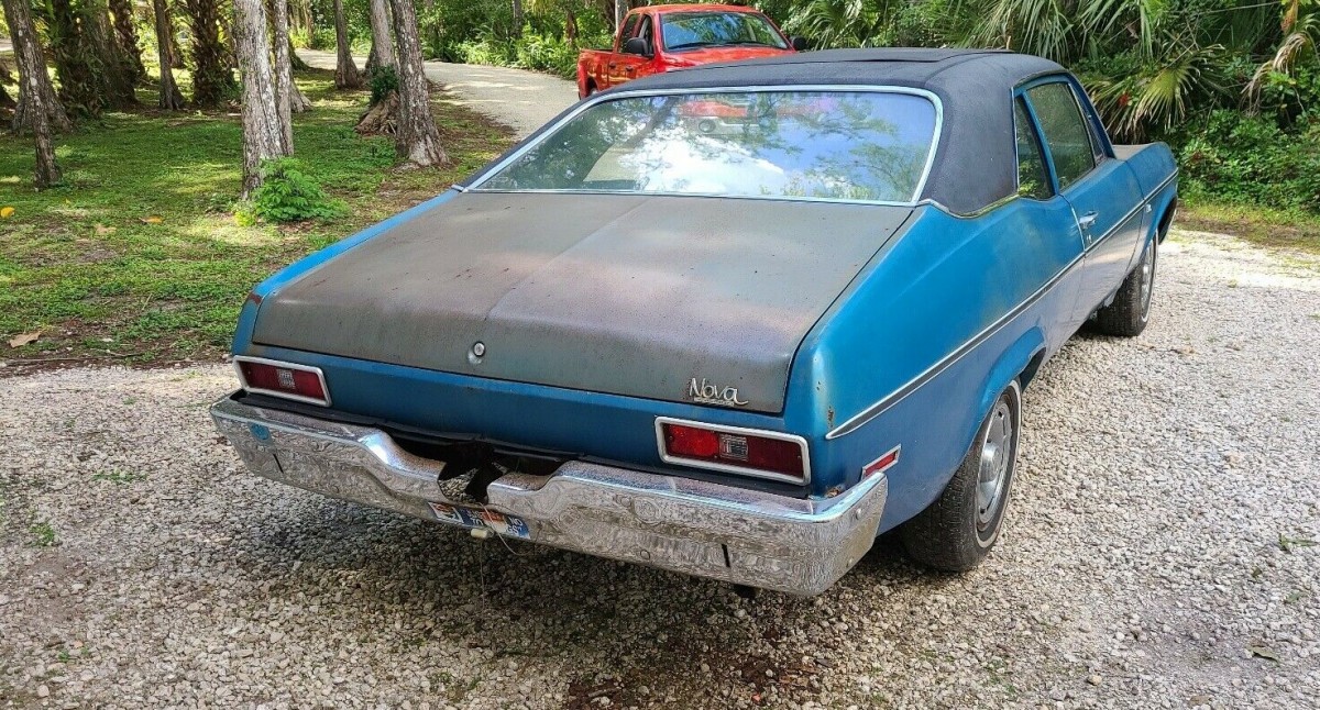 One interesting thing to note is that the rear bumper on this Nova is from a 1973-74 model, not the 1972. They were larger and bulkier and this suggests the car was hit in the rear at some point. Which might also explain why the paint on the trunk lid has deteriorated at a different pace than the rest of the car.