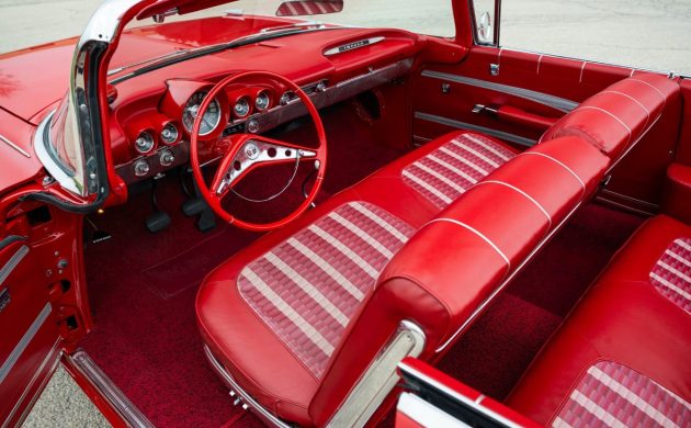 Lifting the hood reveals what makes this Impala so special. The first owner equipped this classic with a 283ci Fuelie V8, a four-speed manual transmission, and power assistance for the steering and brakes. The V8 produces 290hp and 290 ft/lbs of torque, making this amongst the most potent vehicles to wear the Impala badge in 1959. That brings us to a point to ponder. There are no definitive figures on production totals for the Impala Convertible featuring the Fuelie engine, although Rochester stated that it produced thirty-seven engines that were destined for Chevrolet’s full-size models. Several sources agree that only twenty-six of those engines ever found their way into cars, but from there, the trail goes cold. I performed what I admit was a brief search when writing this article, discovering that claims made by various sources that this is a 1-of-2 classic might be inaccurate. I located another Roman Red ’59 Impala Convertible featuring the same Fuelie/4-speed mechanical combination that is currently for sale via a dealer in Chatsworth, California. I also spotted a listing for a Frost Blue example that changed hands in 2011, demonstrating that there were at least three of these cars built. It would require further investigation, but what is undeniable is that these cars are extremely rare. The seller supplies no information regarding the mechanical health, but with only twenty-five miles covered since its restoration, the news should be positive.