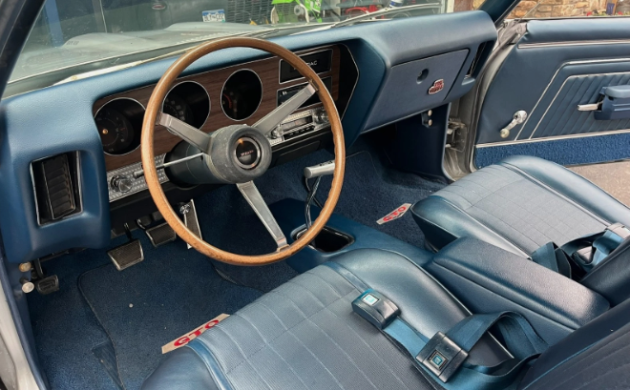 This Pontiac was restored around 2005, and the paint has been redone twice. Since it’s not wearing the more common Carousel Red paint, the car’s blue interior looks right at home. Power is supplied by the car’s original 400 cubic inch V8 with Ram Air III induction and a 4-speed manual transmission. The former has about 8,000 on it since it was rebuilt (as part of the 2005 restoration?). The Poncho was first sold in Wyoming and has only lived there and in Colorado.