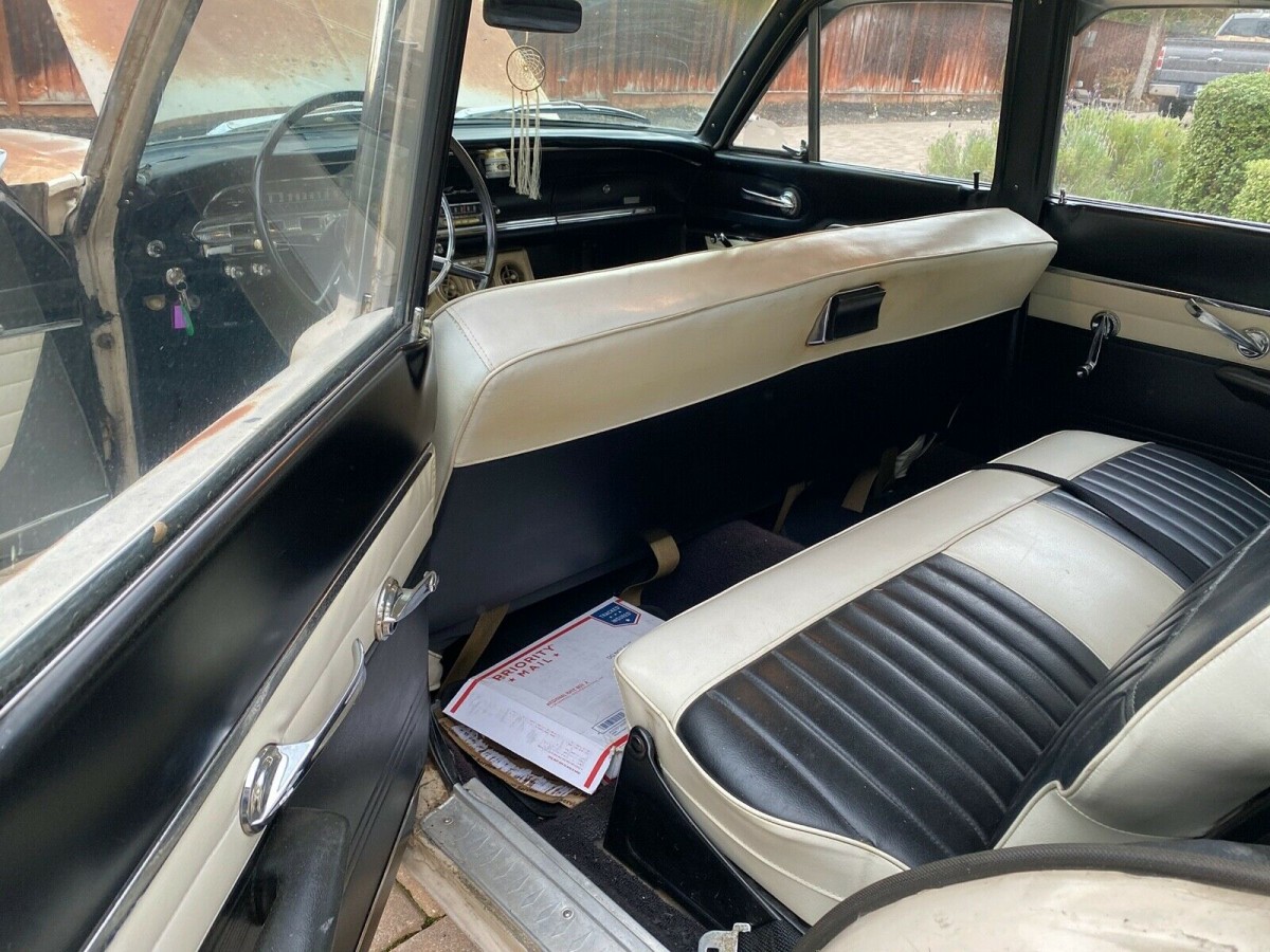 Not bad for its age, and it’s fairly rare. I just hope whoever buys it loses those skirts–they were a parts store aftermarket add-on that look horrible on this `62. Except for cars designed to have skirts, like T-Birds, they do no justice to the car. Find some reproduction factory shelf paper for the sides and give it a decent paint job in the original sand beige, and convert the AC to the current freon used today. The interior looks good enough not to touch except a good cleaning.