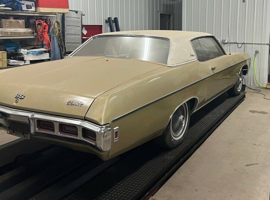 Although restyled for 1969, Chevrolet dropped the long-running Impala Super Sport line but offered the RPO code Z24 SS 427 option at a cost of $422.35. They were available as a two-door sport coupe, custom coupe, or convertible. The seller describes the color as “Brown,” but a paint code guide I found online looks like Olympic Gold. And with that white or cream-colored vinyl top and faux wire wheel covers, the wolf in sheep’s clothing persona is complete. From a distance, it doesn’t look like a muscle car, but up close one can spot the “427” above each marker lamp and the “SS” emblem on the grille, decklid, and fenders. The photos aren’t the best but it looks straight and solid. In describing the car’s paint and exterior, the seller states “It has some nicks, scratches, and a couple of bubbles but is very nice, not perfect, but nice.”