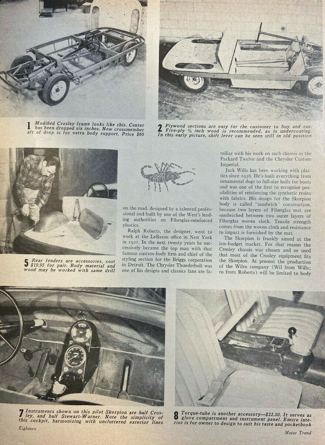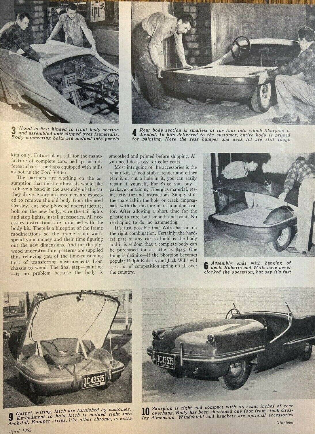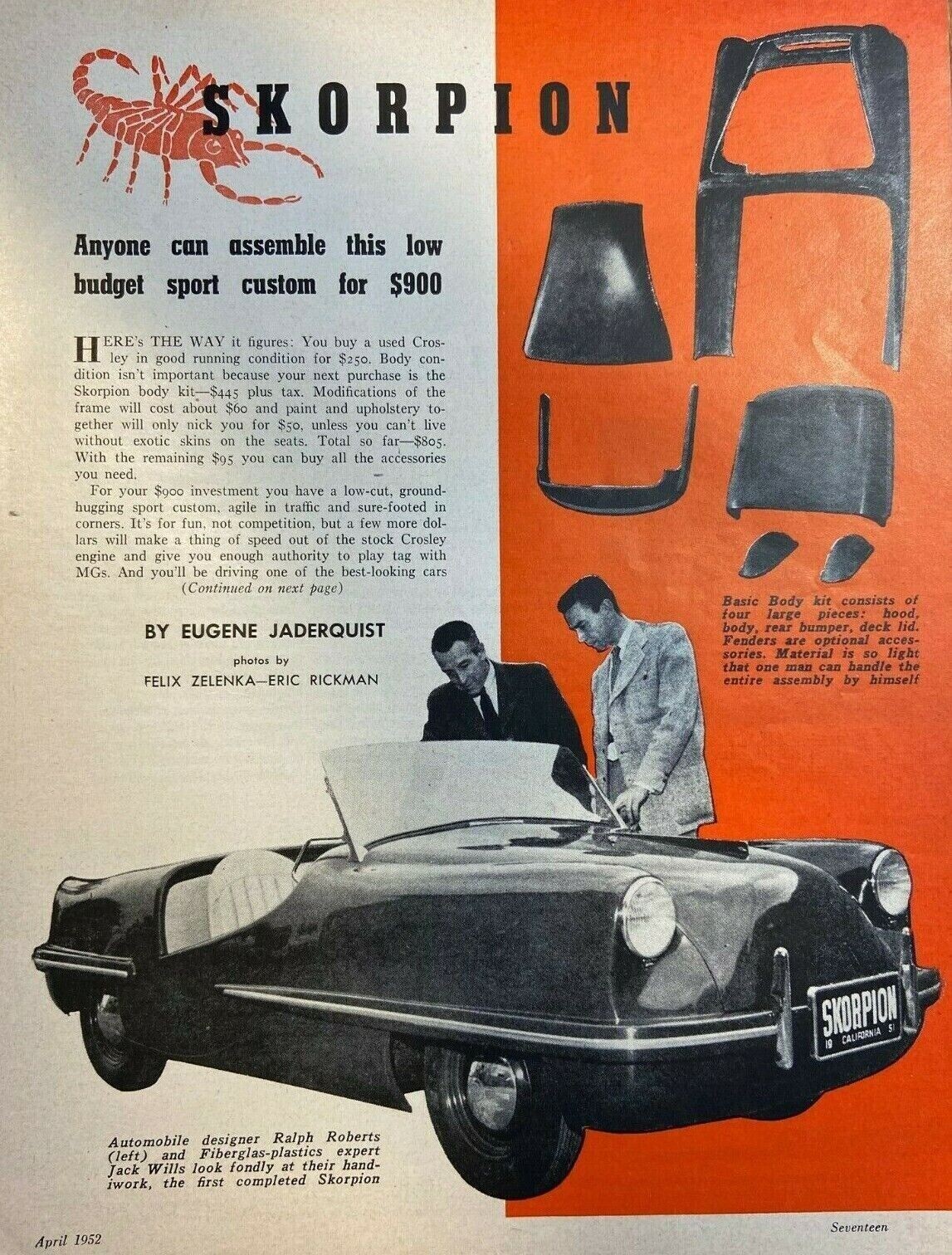 In the early 1950s, Crosley already had two tiny sports cars, the Hot Shot, and the Super Sport. So, these cars (or most anything with a Crosley chassis) could serve as the basis for the Skorpion, a fiberglass-bodied car that was sold largely in kit form with Crosley’s 44 cubic inch inline engines and 3-speed manual transmissions. It was the brainchild of designer Ralph Roberts, but the heavy lifting was done by body man John Wills. Only four actual cars were built by them with maybe two dozen more sold as kits.