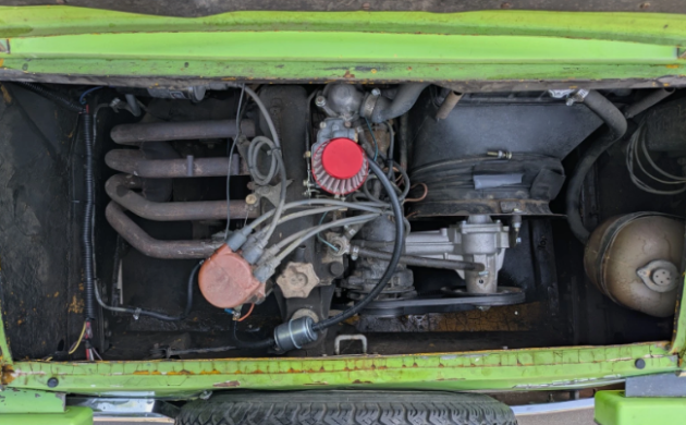 We’re told this little car had some engine work done a few years ago and runs well. While the odometer reads only 19,000 miles, the seller has no idea how close to reality that might be. This was his late father’s car, and it’s spent the last 17 years in storage. It wears bright lime green paint, but the yellow floorboards suggest a color charge was made some time ago. The paint looks okay except for the underside of the “hood” (aka trunk), which is all cracked.