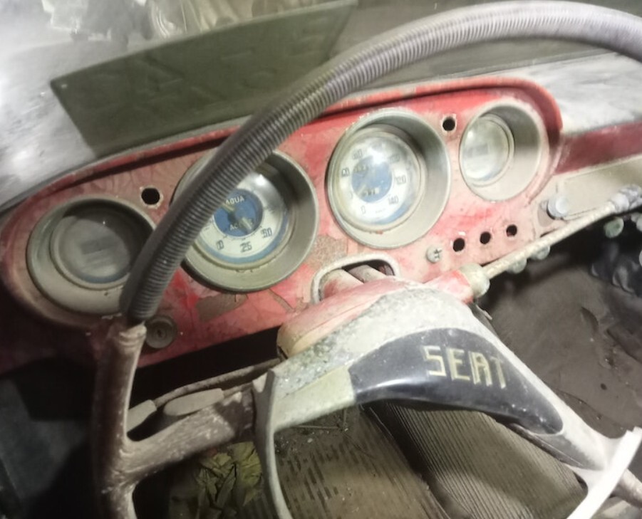 For some reason, the front end of this car reminds me of the 1958 “Packardbakers” where Studebakers gained grated-on quad headlight pods. The steering wheel looks like something from a 1960 Chevy, though it has the SEAT name. Interesting almost one-off.
