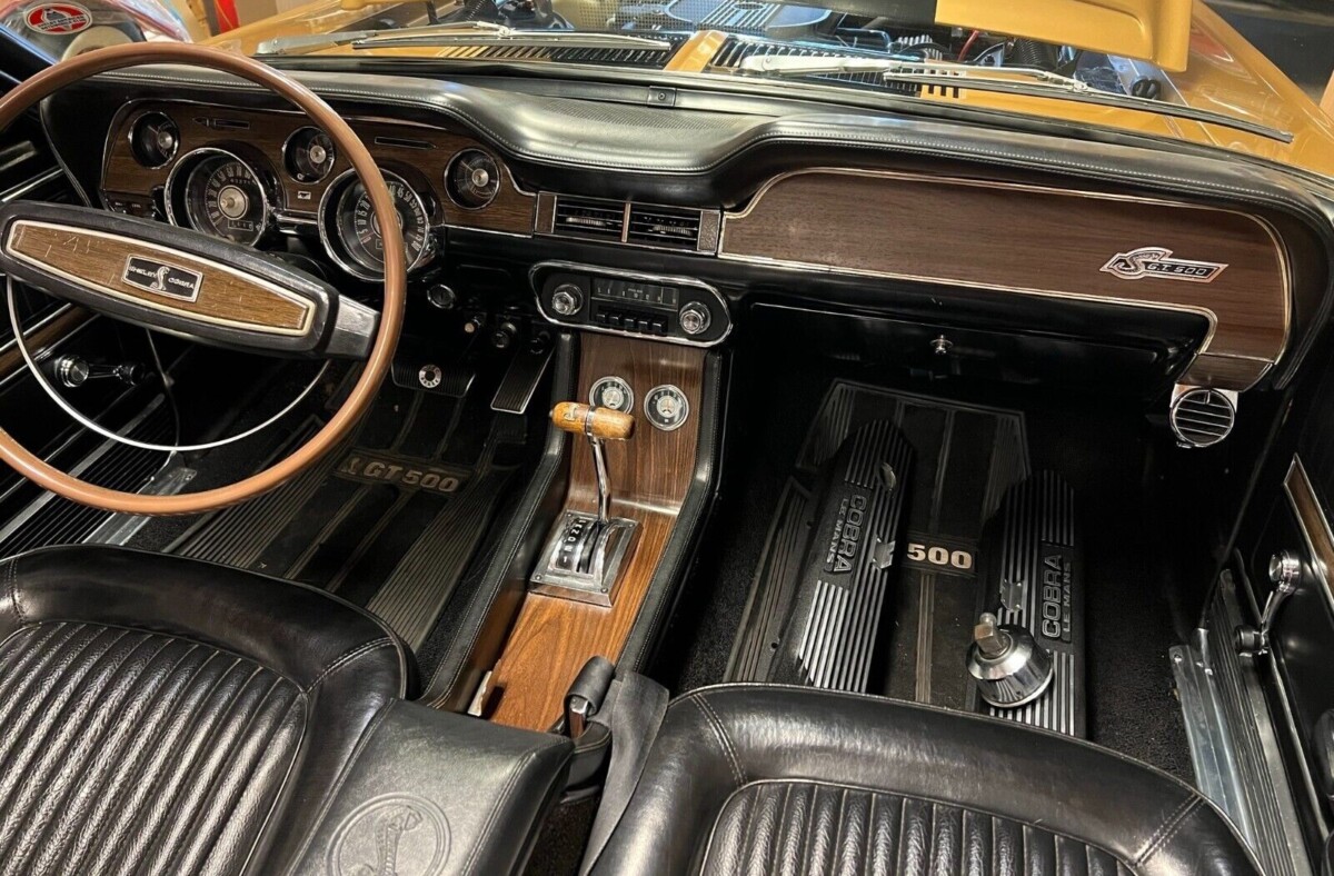 The first Shelby Mustangs originated with the 1965 versions of the stock automobile that started the “pony car” craze. These autos dominated foot traffic at Ford’s (and its competitor’s) dealers for the balance of the decade. In the beginning, Ford would ship cars to Shelby to modify, but internal issues within Shelby led Ford to take over the conversion process themselves, with the help of A.O. Smith. That would occur in 1968 when Shelby assemblies increase to 4,451 overall, including the GT350. Given the Marti Report provided by the seller, this example appears to be in rare company: 249 GT500 drop-tops built with automatic transmission, 36 painted Sunlit Gold, 8 with air conditioning, and just 2 shipped to the same dealer in Texas where the seller’s car was originally sold.