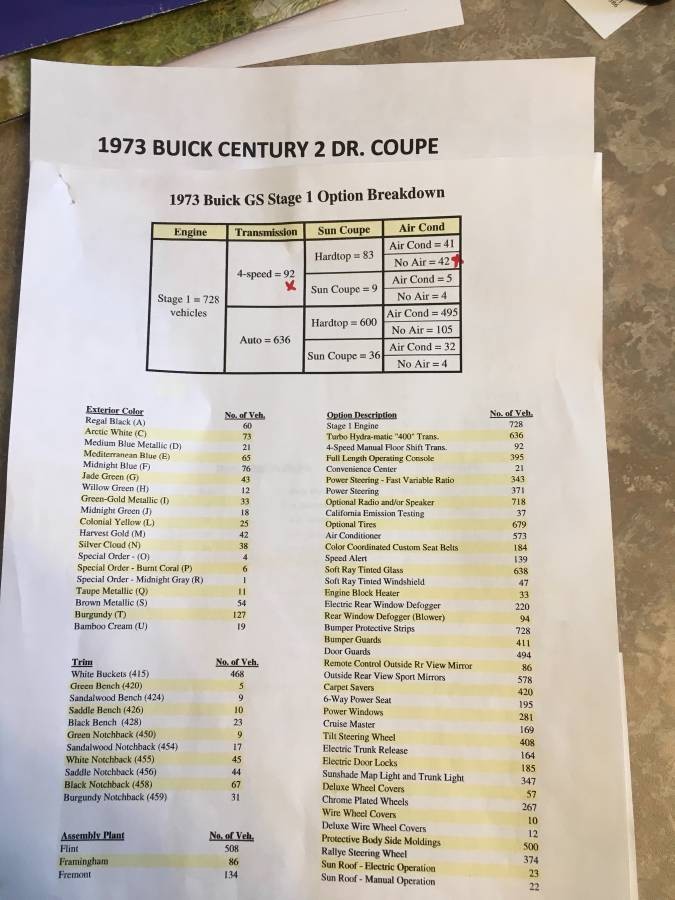 I had a 73 century 4 door, optional 350 2 bbL, 3 on the tree, radio and carpet delete, vinyl seats, rubber flooring, heavy duty sway bars front and rear and a shock absorber sway thing in the front making those high speed highway exits nice and flat!!! Manual steering and manual brakes. 1 of not too many I bet! With I still had it. It went really well after removing all the smog stuff!