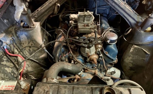 There appears to be nothing numbers matching here with a 302 V8, 4-barrel carburetor, 4-speed manual transmission, and twin exhaust. We’re told it runs, but we see no cap on the radiator. The transport has been in storage for not just years, but decades. Though we’re also advised that the body is solid, a bunch of welding work awaits the buyer. That includes the front floorboards, one of the wheel wells, and one of the upper panels.