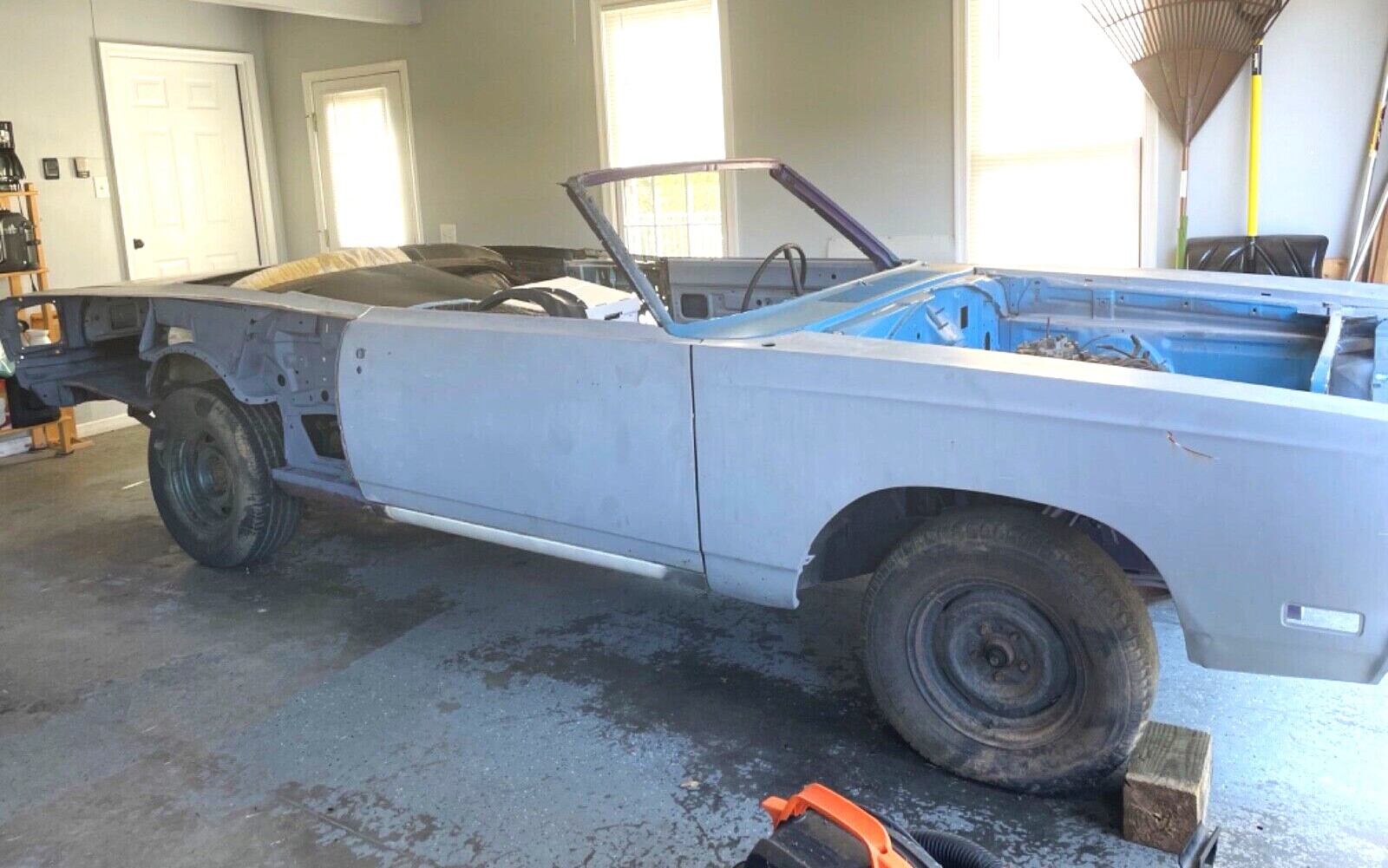 When it was built, this Plymouth was finished in Ice Blue Metallic paint and came with a bench seat interior, possibly black. One of the options on this auto included the desirable N96 Fresh Air Hood (though it’s MIA now). Much of the sheet metal has been replaced or repaired, so rust shouldn’t be a big issue going forward. One problem area, though, is the convertible top frame which will need fixing (replacements may not be available in the aftermarket).