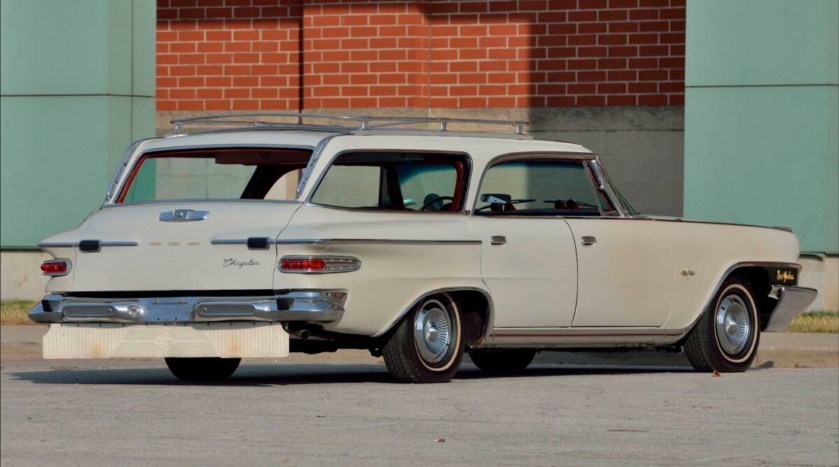 The 1962 Chrysler Town & Country was a bit of a novelty in that it was a hybrid of the Plymouth 4-door station wagon with a New Yorker front clip (slanted headlights) attached, both from 1961. The reason for this was that Chrysler had abruptly canceled its 1962 redesign late in 1960. Rumor has it that General Motors was going to downsize its 1962 models and Chrysler didn’t want to be left with oversize cars to sell (the rumor turned out to be untrue). So, for 1962, they hastily did some patchwork on the 1961s. For the T&C, the Plymouth wagon was chosen because it was Chrysler’s only finless full-sized station wagon. The Plymouth’s existing taillights were replaced by wrap-around units.
