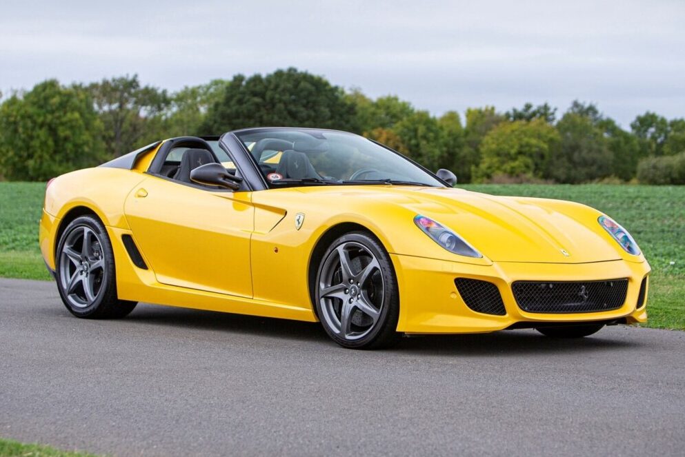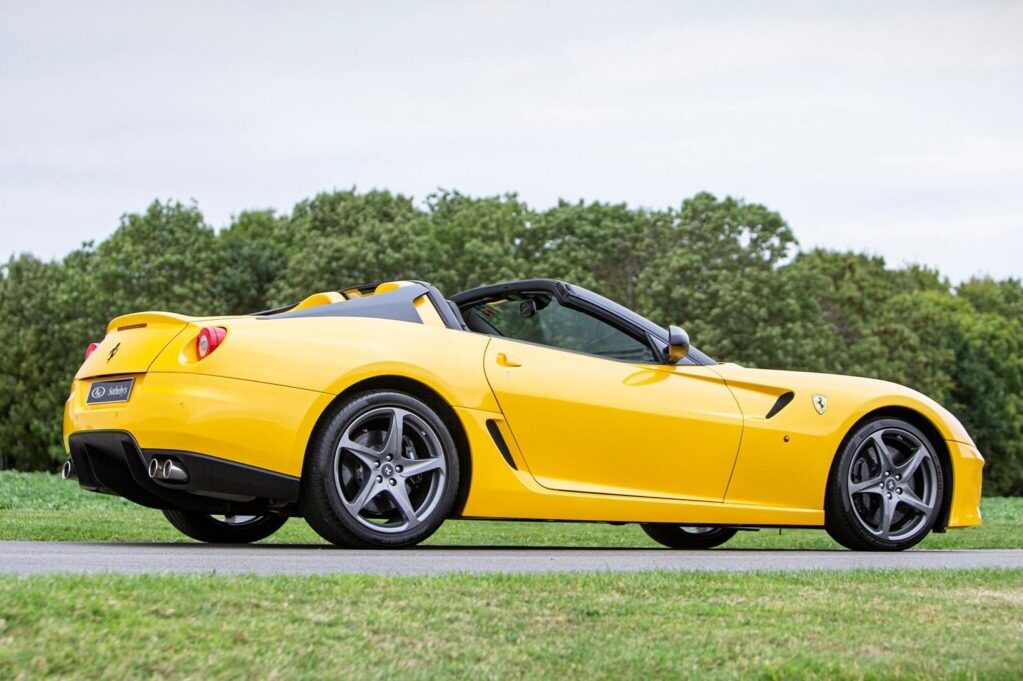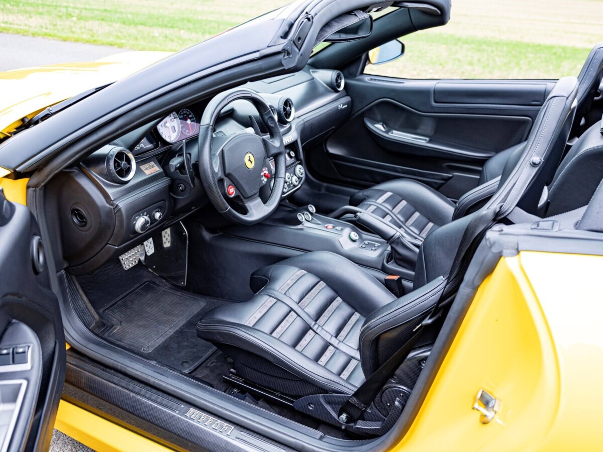 Ferrari introduced the 599 in 2006 and classified the new model as a Grand Tourer rather than an outright supercar. Sale totals were respectable, but many enthusiasts didn’t immediately warm to its styling. The company has a long history of utilizing the legendary design house Pininfarina to devise vehicle styling. It felt that it was only fitting to produce a new 599 variant to celebrate the collaboration and mark Pininfarina’s eightieth anniversary in 2010. Ferrari desired to go beyond simply adding badges and other automotive “tinsel” to an existing model, producing a car with marked styling changes. These included reducing the windshield rake and removing the 599’s distinctive flying buttresses in favor of fins integrated with the roll hoops. Our feature car wears distinctive Giallo Triplo Strato paint, which is dazzling and provides a refreshing change to the traditional Red worn by many of the company’s offerings. It presents superbly, which is unsurprising considering it is a one-owner vehicle with a genuine 8,600 miles on the clock. The paint and panels are flawless, the glass is crystal clear, and the beautiful 20″ wheels allow plenty of cooling air to find its way to the enormous carbon/ceramic disc brakes.