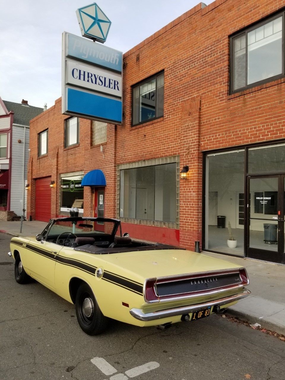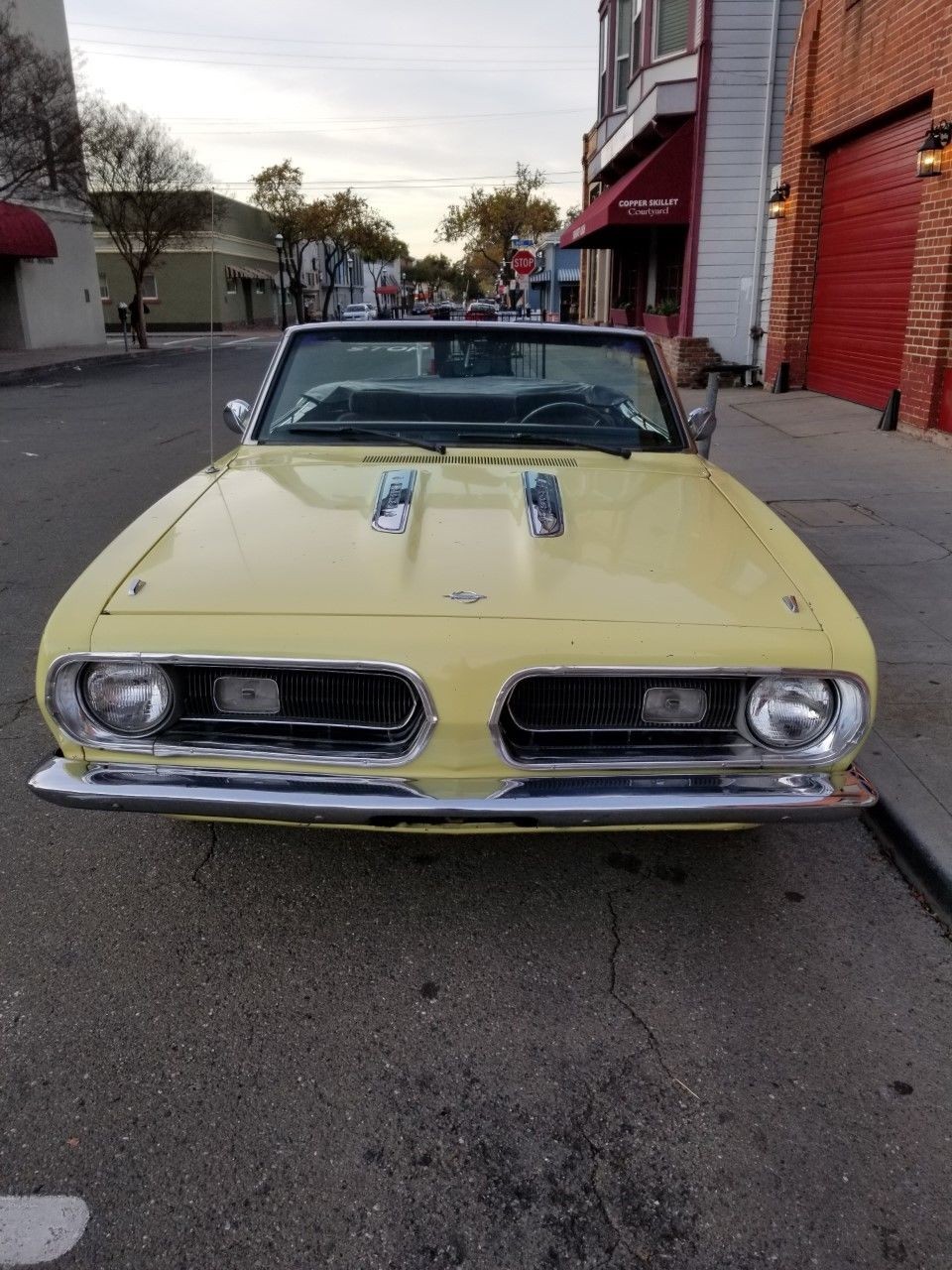 Finished in Sunfire Yellow, the Barracuda is a fairly neat and clean looking car. Rust is limited to a few small bubbles at the bottom of the passenger side quarter panel. The black convertible top is present, but it is pretty sad looking and will need replacing. The originality of the exterior has been impacted by the replacement of the hood and front header panel by panels from a ’68 model by a previous owner. Apparently, they preferred the look of these panels.