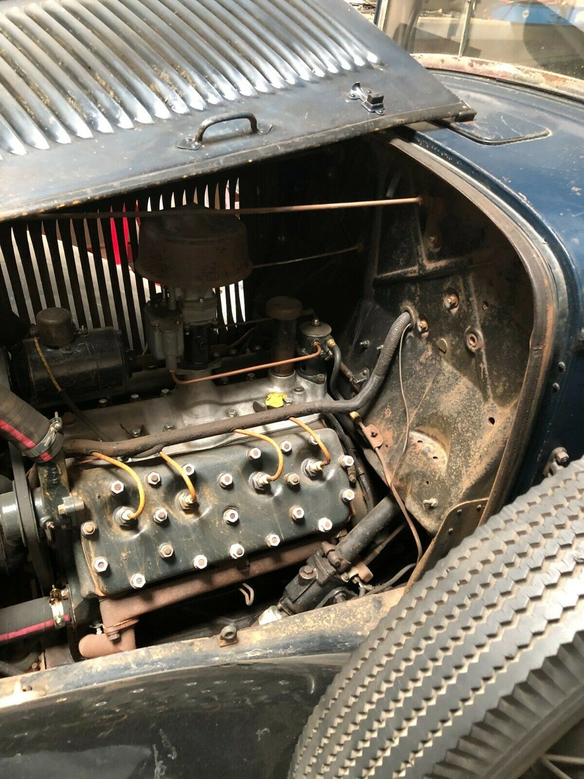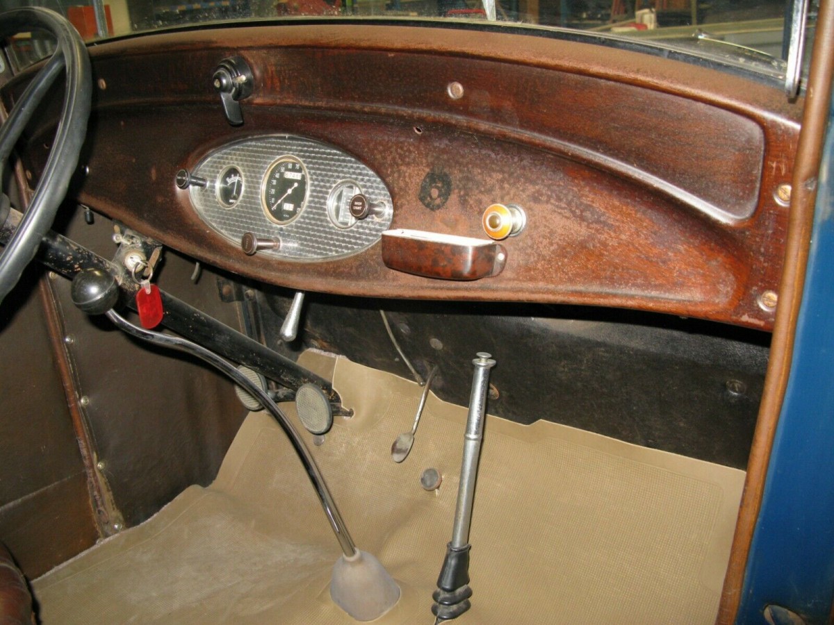 This edition was painted in Washington Blue and finished with a leather interior, both of which are original to the car after nearly 90 years. The fenders, however, may have been touched up at some point, and remnants of pinstriping along the body are still visible in places. There is no mention of rust other than surface and, of course, it wears its patina well. The luggage rack has survived nicely, and the seller has documents that provide its ownership timeline.