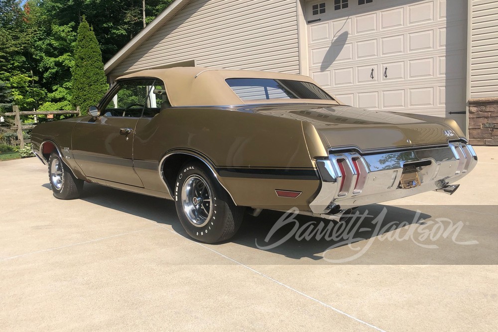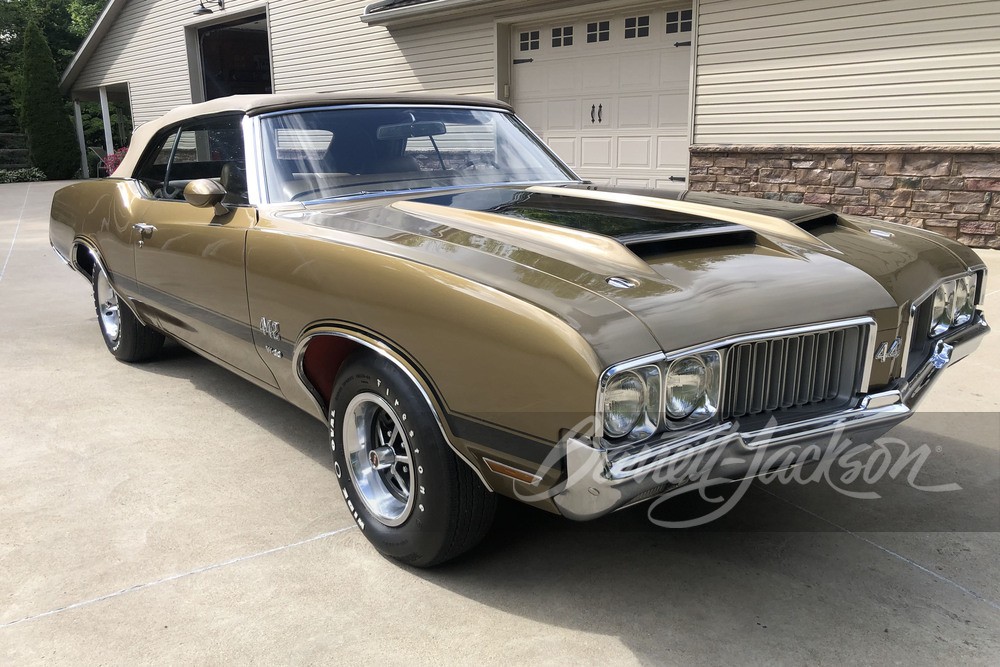 Oldsmobile got into the mid-size muscle car movement in 1964 with the 4-4-2 (or 442) based on the Cutlass. It was every bit as potent as any of the rest of its corporate cousins. The W-30 option, which became available in 1970, gave the car a fiberglass hood with functional air scoops and low-restriction air cleaner, an aluminum intake manifold, and a special camshaft, cylinder heads, distributor, and carburetor. This 4-4-2 W-30 comes as a convertible with a 4-speed, making it one of just 96 built that way in ‘70. It will be available here on Barrett-Jackson on September 16-18, 2021, in Houston, Texas. Thanks, Larry D, for making us aware of this cool survivor!