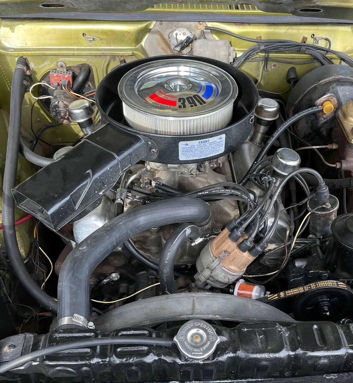 I bought one NEW… in ’71 from a dealer who had only one ’70 AMC left on his lot and he made me a great deal. I jumped when I saw this one… looked like mine. That Green paint changed colors under different lights at night… from Green to Gold and back again. I loved it. Mine also had the scoop on the hood… I was told it had the limited slip dif. and a few other things… it had automatic with tilt steering wheel… it DID have Air conditioning and I remember that the control had a “Desert” position on it… what ever that meant. The inside was a very nice brown leather, looked very luxurious to me. Being a very young guy at the time I remember being a little disappointed that it would not “fly”. Yeah, it was fast but not as fast as I expected it to be.