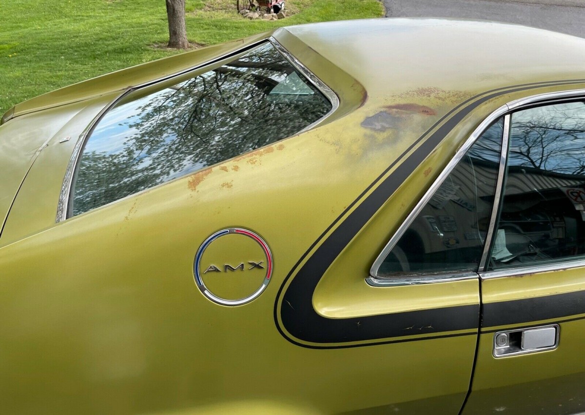 This ’70 AMC is said to carry its original Lime Gold paint and looks good until you get up close. There is fading, discoloration, and a little surface rust on both roof panels near the AMX logo. Probably nothing to worry about right away but something to keep an eye on. Both bumpers have been re-chromed, and the grille and taillights replaced with NOS. The weather stripping is all original, but the seller is sending along a new set should the buyer want to replace it. The interior looks extremely nice as it should given its new leather seat covers and door panels. This car came with factory air conditioning, but the compressor and condenser were removed (and coming with the car).