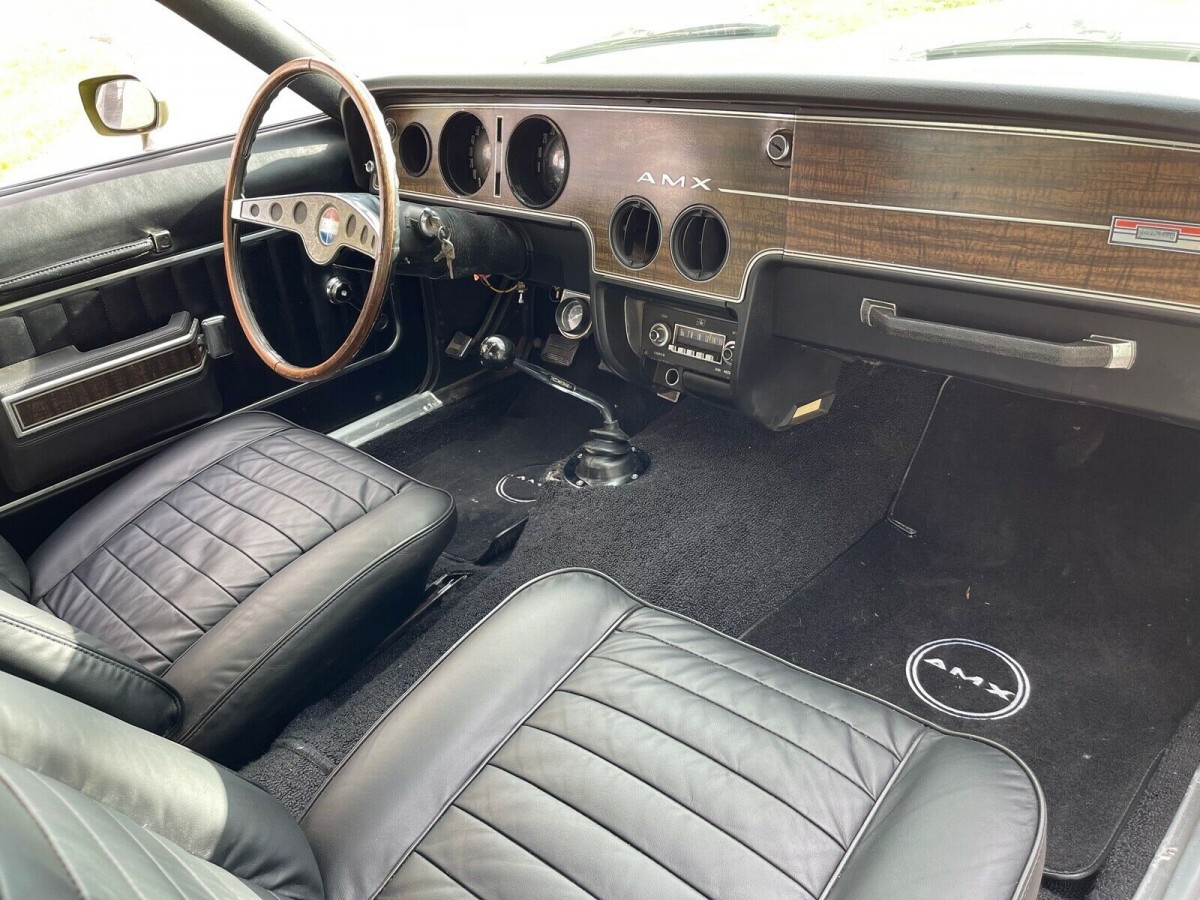Before being integrated into the Javelin line (due to low sales), the AMX was built between 1968-70. The latter had the lowest numbers, just 4,116 cars out of 19,134. Of that, 1,632 had the 390 cubic inch V8 with a factory 4-speed. This car was equipped with the “Go” package (aka Go Pack) which in 1970 included the 390 motor. According to AMC archives, 340 of them came with Twin Grip posi-traction, 823 with tilt steering and 98 had black leather seating. The latter could include the seller’s 1970 AMX.