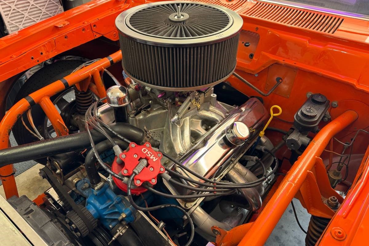 Not many of this Gremlin’s original parts and pieces are likely left besides sheet metal. These cars were mostly powered by inline-six engines, though a small-block V8 was added to the mix. That’s all gone, replaced by the 401 paired with a 727 TorqueFlite automatic transmission. A tube chassis resides underneath, and the rear has been tubbed to accommodate wide racing slicks. A humongous air scoop sticks out of the hood, and you have to wonder what visibility is like looking to the right.