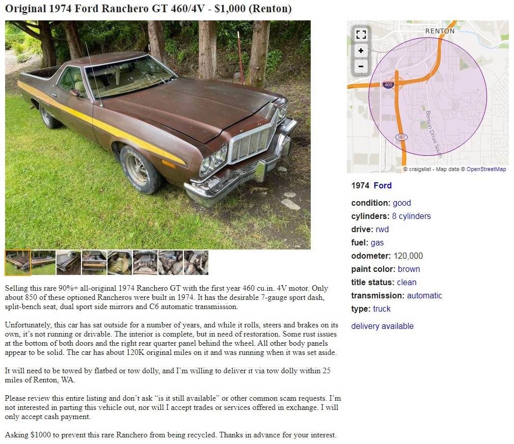 The seller is listing this 1974 Ford Ranchero GT low enough to hopefully save it from the crusher, at $1,000. Looking at this first photo, there’s a lot more than a grand worth of parts on this car, even if the whole carcass can’t be saved, and I’m hoping it can be. The seller has it posted here on craigslist in Renton, Washington. Here is the original listing, and thanks to Scott for the tip!