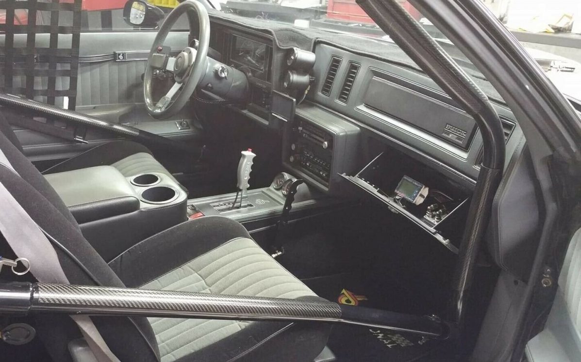 The interior is a blend of racecar and standard Grand National. The original driver’s seat, which looks to be in nice shape, is outfitted with a racing harness while the passenger seat appears to be unused. There are auxiliary gauges and switches that have been nicely integrated into the standard Grand National layout. While the shift lever has been replaced to accommodate the racing transmission, things like the steering wheel and instrument panel remain as originally intended. Of note, is the added roll cage.