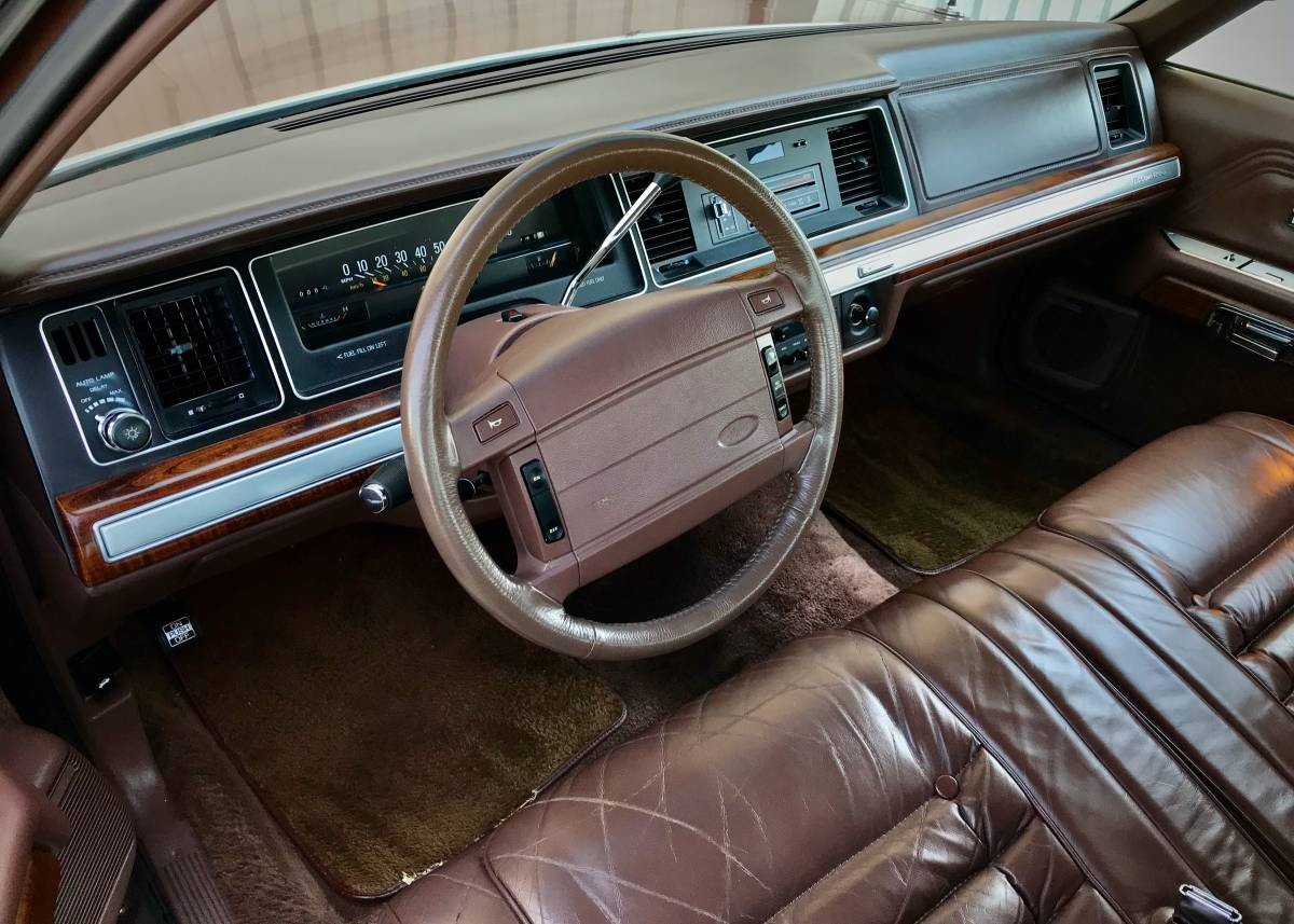 Now, while the seller’s asking price is ambitious (in my opinion), there’s no doubting that the Crown Victoria is in outstanding condition. The interior is particularly handsome, and I don’t recall seeing too many models like this with a mocha brown leather interior. The dash is in perfect condition with no cracks and the fascia, with its fake-but-attractive woodgrain trim and crystal-clear gauges look as mint as you can get. The carpeting is likewise in excellent shape with no signs of major stains or tears, and the backseat and trunk carpeting are both in similar condition. Truth be told, the backseat looks like it’s never been used.