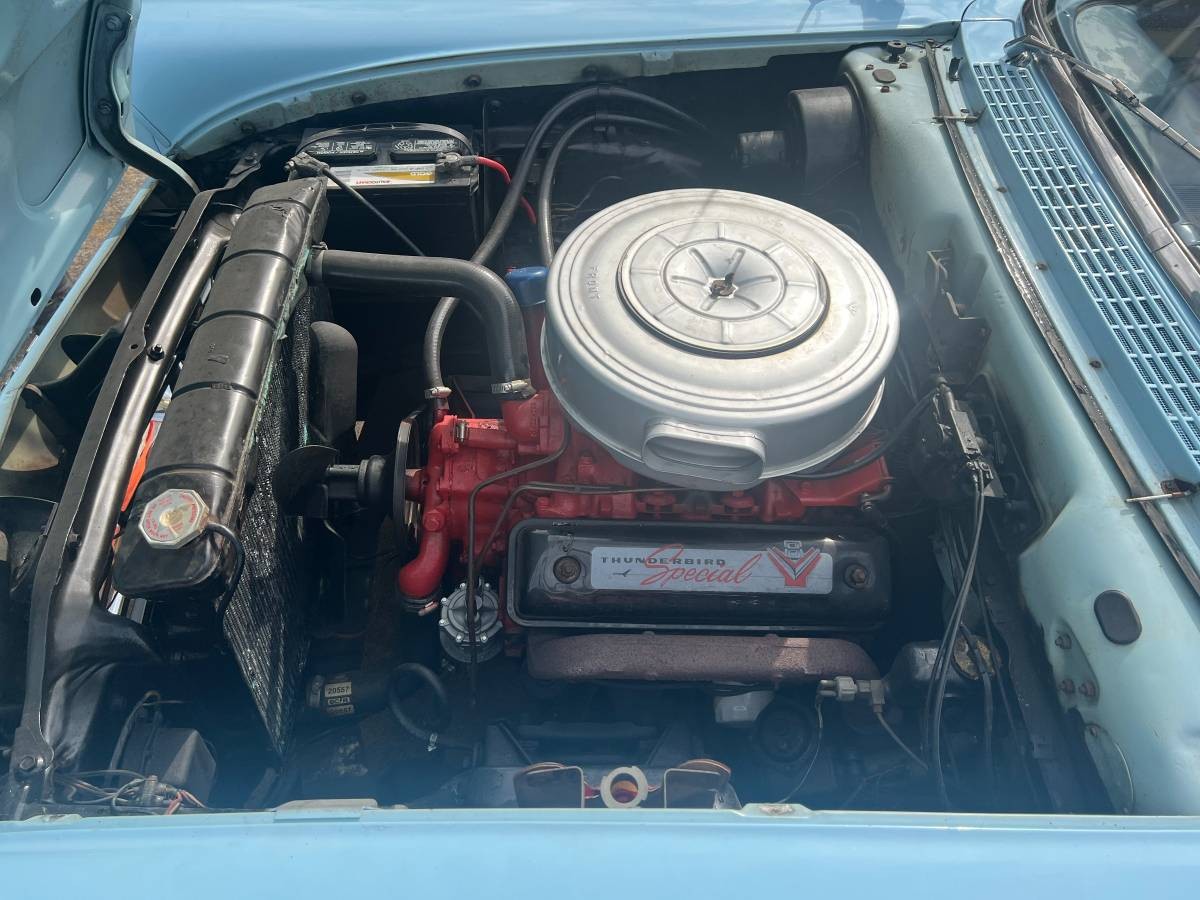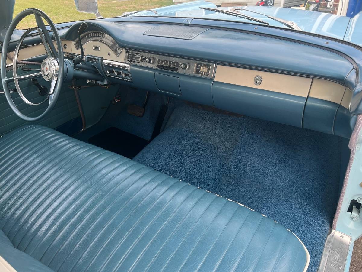 If the Fairlane’s exterior makes a positive impression, its interior serves up more of the same. The upholstered surfaces wear a combination of Blue and White vinyl, perfectly complimenting the exterior paint shades. The upholstered surfaces appear spotlessly clean and free from wear, with the back seat looking like it has never been used. The carpet has some slight marks across the transmission tunnel, but if it is original, it has survived in exceptional condition. The dash and wheel look crisp and clean, and if the luxury of a folding hardtop isn’t enough, occupants also receive a clock and a pushbutton AM radio.