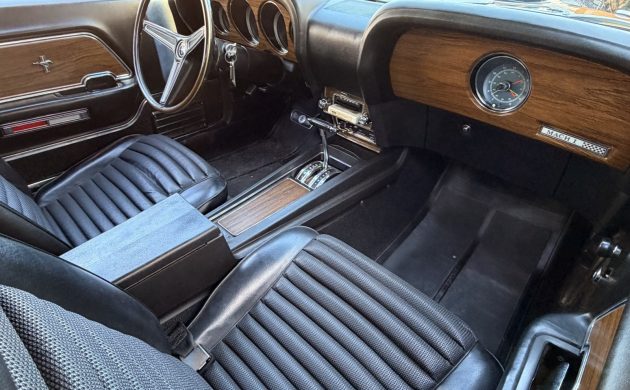 Apart from some stretching on the driver’s seatcover, there isn’t much wrong with this Mustang’s interior. Trimmed in Black vinyl, the presentation is first-rate. The trim is excellent, the carpet shows no significant wear, and the woodgrain looks virtually perfect. The dashpad hasn’t crumbled around the speaker grille, and the wheel is crack-free. It is essentially unmolested, featuring the desirable Sport Deck back seat. The factory AM radio was replaced by a dealer-installed radio/8-track player at some point. However, I don’t view that change as detrimental to the car’s originality or potential value.