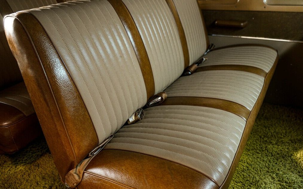A lifelong Idaho resident, this van has experienced 104K miles and even comes with a Marti Report – that’s a first for me, a van with Kevin Marti’s seal of approval. It shows very well in a big, bold, brown way. There’s a ding or minor dent here and there but nothing beyond that. While the finish is still strong and deep, the roof appears to have some fading or discoloration occurring. There is no indication of rust and the brightwork, which is primarily comprised of the full-width grille and headlight surrounds, is still bright with a luster. Other than the orange fog lights, the entire exterior appears as original and unmodified – this is a van that has been well cared for.
