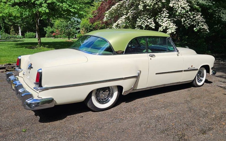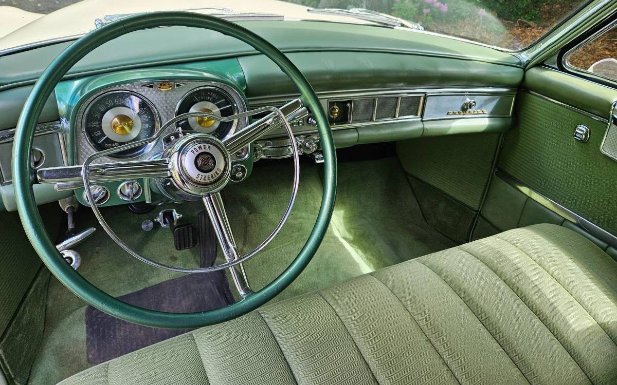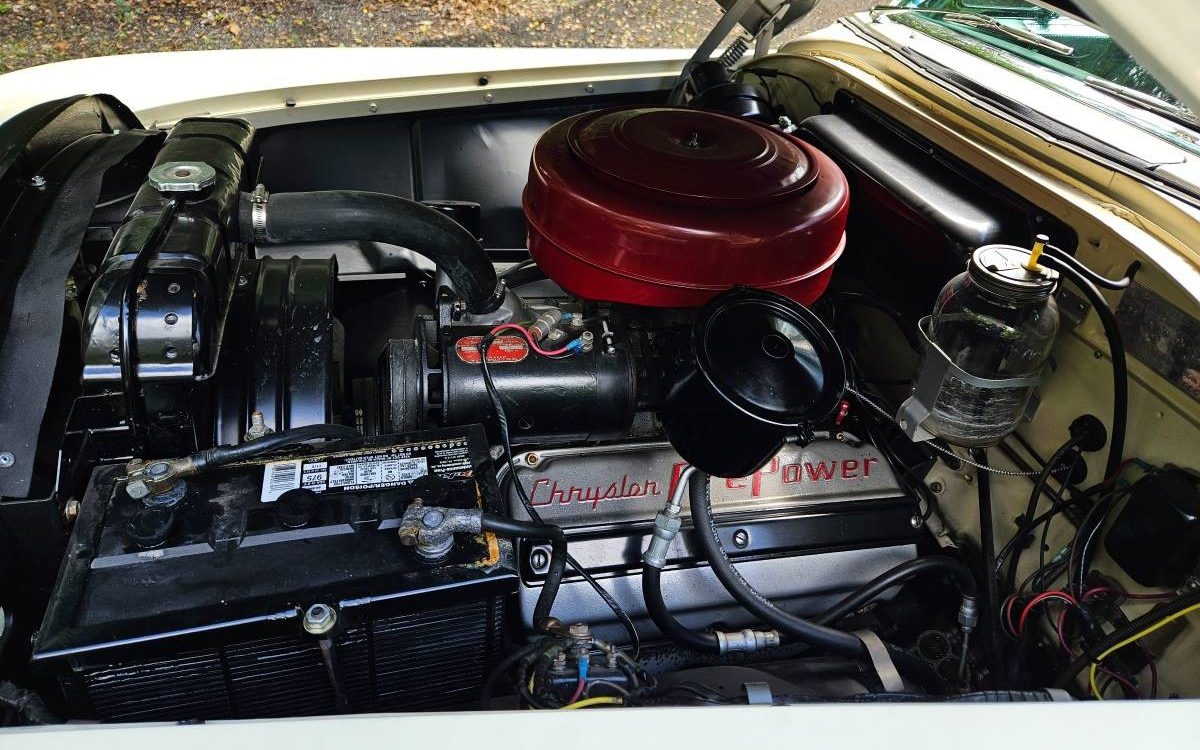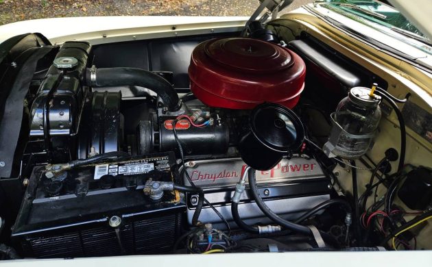 The ’54 Imperial had the Powerflite two-speed automatic and a 3.54:1 axle ratio; the gear was tempered by 8.20×15 white sidewall tires, which were over 29.5 inches in diameter. The owner has installed radials in their place, which are mounted on real chrome wire wheels. The Imperial’s plush green interior is new, and the original owner ordered power windows and a power seat. Power steering was big enough news in 1954 that Chrysler embossed it on the horn ring for all to see.