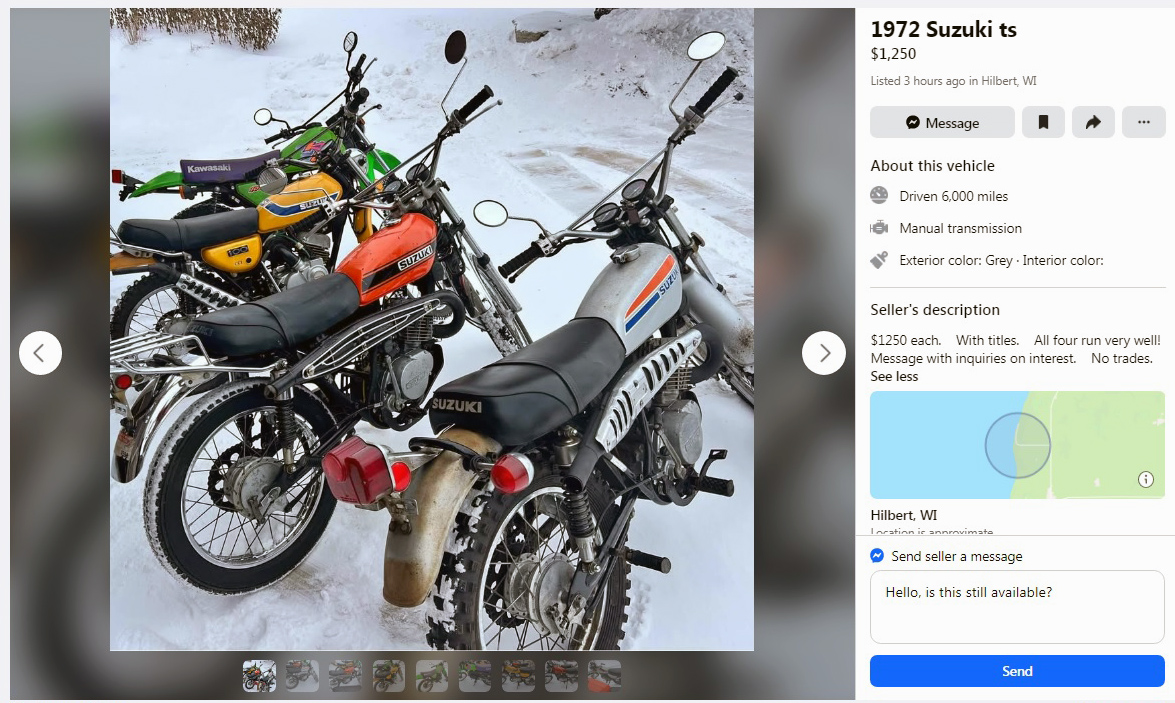 In case you haven’t noticed, prices have gone up for some vintage vehicles over the last couple of decades, says Cap’n Obvious. Sometimes, they seem reasonably priced, such is the case of these four 1970s Suzuki and Kawasaki on/off-road bikes, two 100s and two 185s. The seller has them listed here on Facebook Marketplace in Hilbert, Wisconsin, and the seller is asking $1,250 each. Here is the original listing, and thanks to Lothar… of the Hill People for the tip!