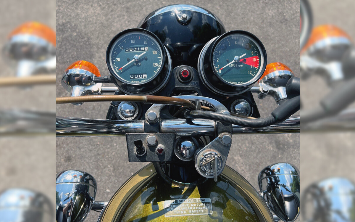 This particular CB450K5 appears to be in outstanding condition and the seller has provided many great photos – well done! This color is outstanding: Candy Bacchus Olive. Just reading about a color like that brings tears to my eyes, compared to the black, white, silver, and gray vehicles of today. The seller says that the last owner bought it in 1973 with 100 miles on it and has driven it sparingly over the last five decades, otherwise keeping it in their heated garage.