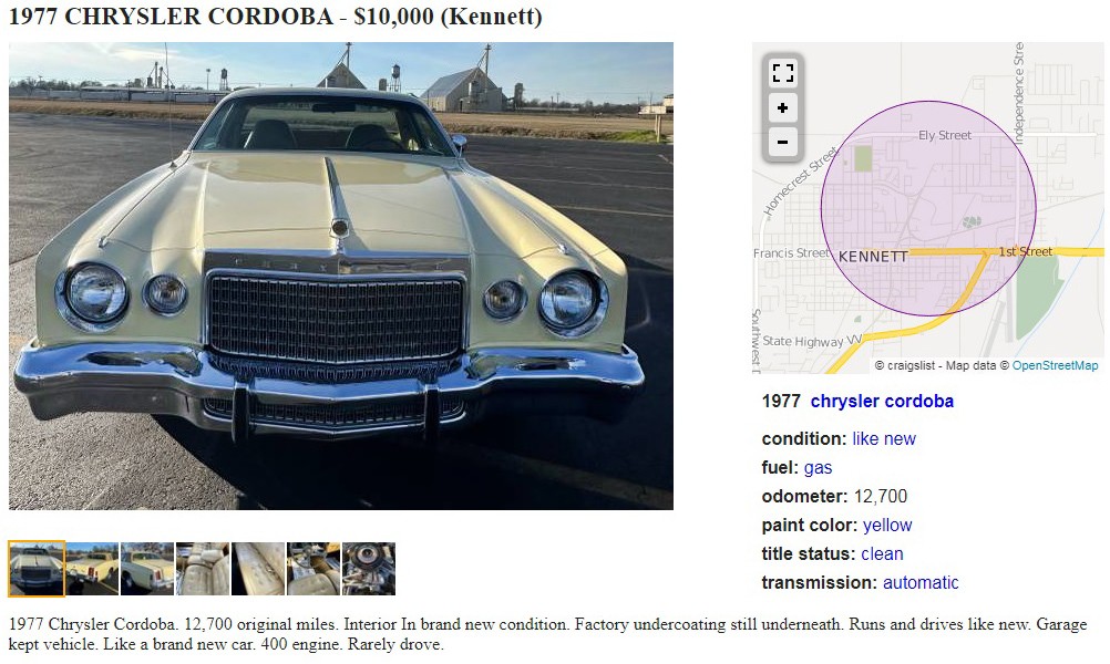 Driving a vehicle 265 miles a year isn’t a lot. Per year, not per week or even per month. It’s hard to believe there are cars like this 1977 Chrysler Cordoba still hidden out there in the world, ones with only 12,700 miles on the odometer after 48 years. There must be, Zappenduster found this one and sent it in as a tip, thanks! It’s posted here on craigslist in Kennett, Missouri, they’re asking $10,000, and here is the original listing.