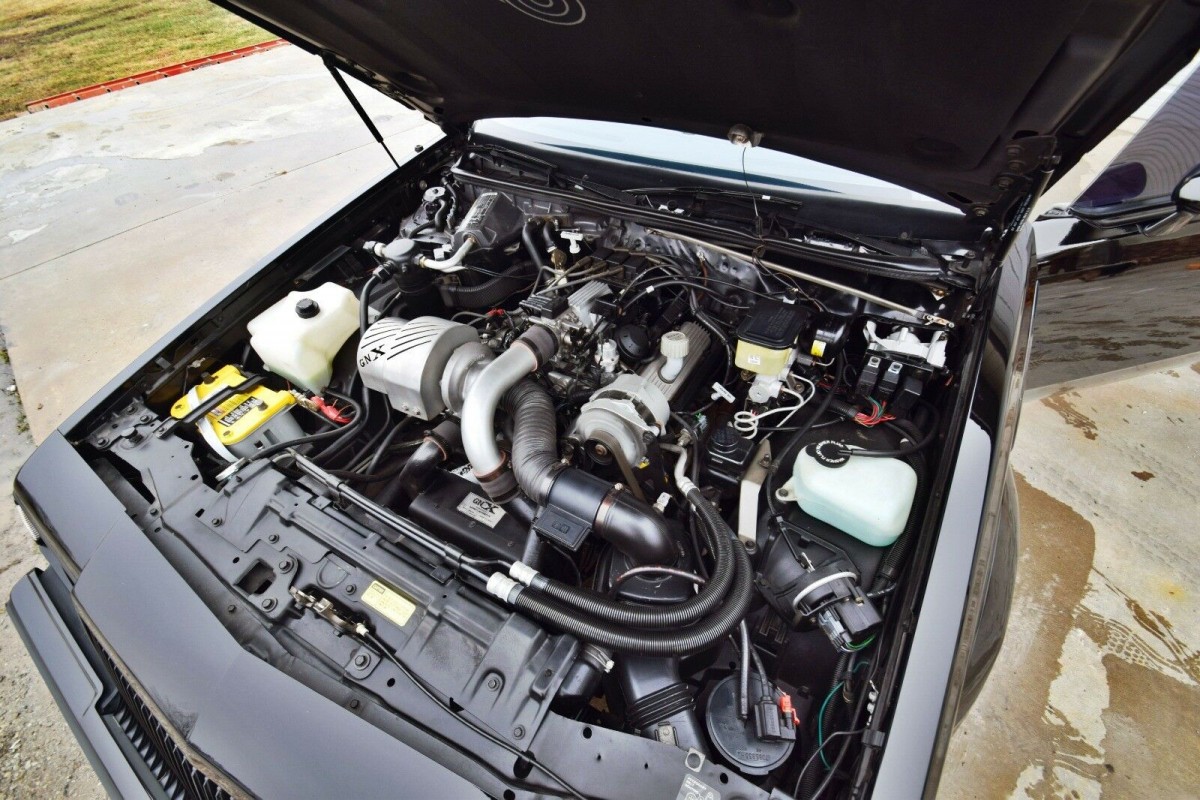 While the paint on the GNX was made to shine, a GNX shines under the hood for an entirely different reason. The Buick 3.8-liter V6 engine was breathed upon rather heavily, and the combination of a Garrett AiResearch T3 turbocharger with a ceramic impeller and a large intercooler allowed the GNX to produce an official 276hp. Unofficially, that figure was actually closer to 300hp. This power then finds its way to the road via a Hydramatic 200-4R transmission. Power steering and power brakes assist to point and stop this beast. There have been some changes made to this GNX. It is fitted with a different turbo, but the original is included with the car, while it is believed that the exhaust is also non-genuine.