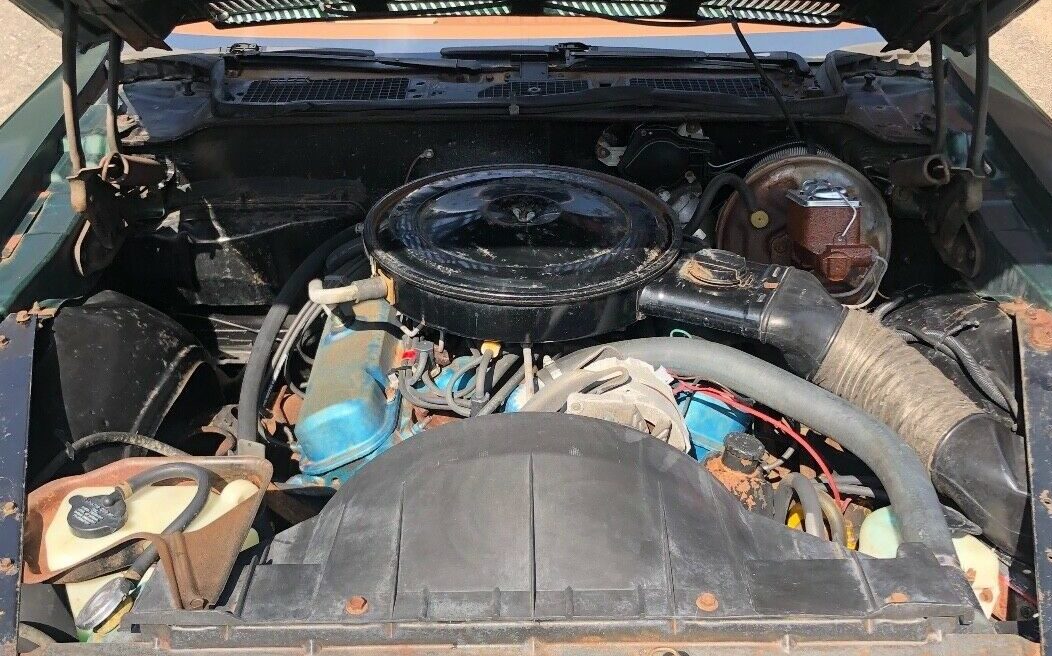 Aside from the tears in the driver seat and the discolored carpet, the interior looks to be in pretty good shape. The dark saddle upholstery offers a nice contrast to the exterior and is a pretty tame and timeless combination compared to some other 1970s muscle cars. Again, to make it “like new” the seller suggests replacing the headliner, carpet, and front seat upholstery.