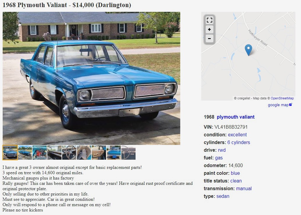 In my experience almost every seller sets their price higher than their bottom line. Every buyer will want to negotiate a better deal. That’s the process. So far I am holding true to my pledge at the beginning of the year not to pass judgment on price. I have tried to readjust my thinking that unless I am making an offer myself then my opinion on the asking price is irrelevant. Also like everyone else I can’t believe how the cost of everything has gone up so much in the last few years. So $14K? Who really knows anymore. I like this Valiant a lot and I doubt if you could find any nicer. Someone is going to get a time capsule vehicle that harkens back to a time when Detroit was producing simple, economical and affordable cars unlike the rolling computer carts built today. GLWTS.