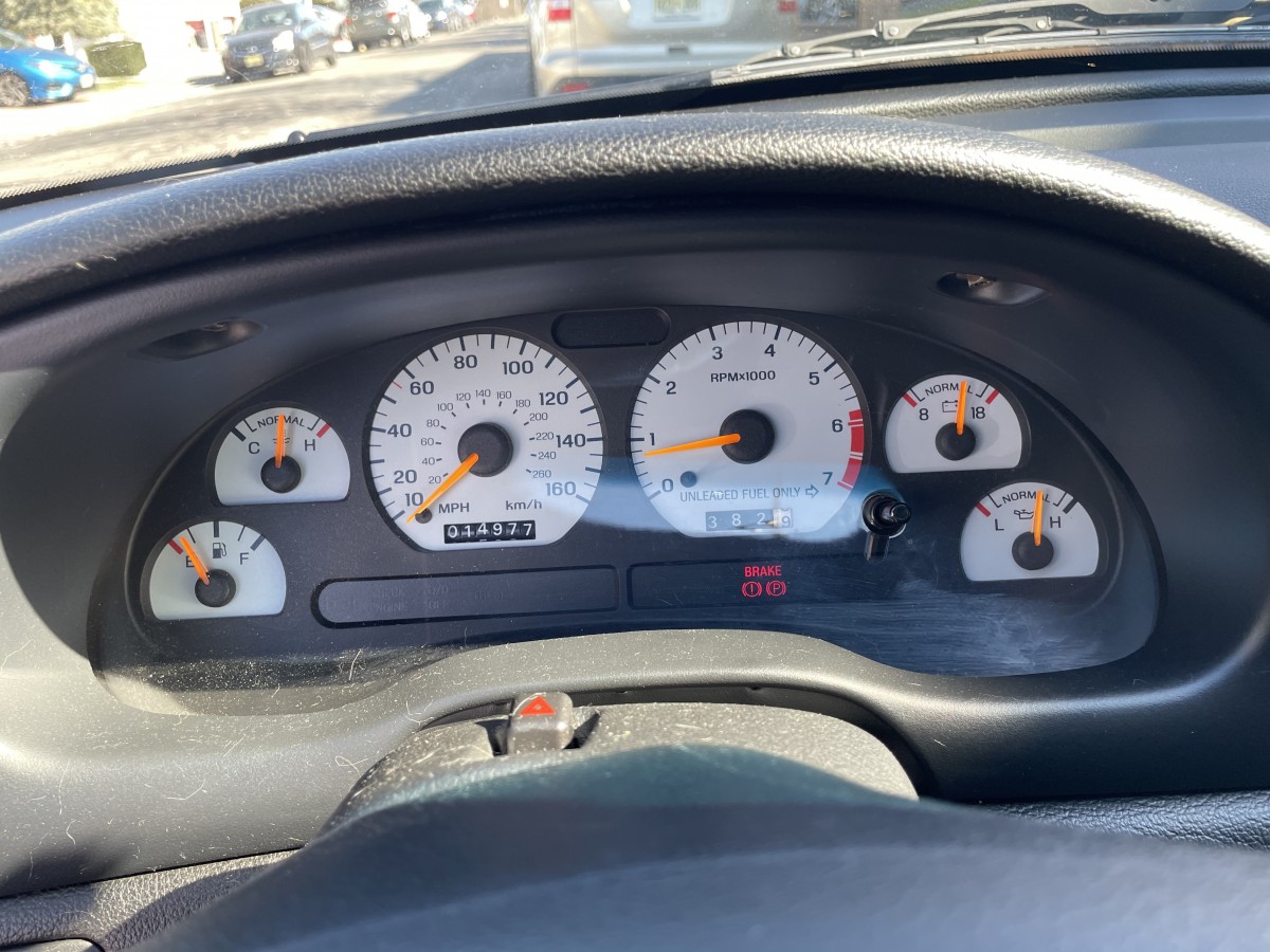 White face gauges and a steering wheel stamped with the words “Cobra” greet you inside, and it’s surprising to see cloth buckets instead of leather in the higher-end Mustang offering. But it’s also not surprising given the SN95 was not a complete make-over of the ’93 models despite having a thoroughly refreshed exterior appearance. The Cobra was given mixed reviews, as it still couldn’t catch the Camaro of the same year and was only marginally faster than the standard GT – but limited production muscle cars rarely go unloved, and there’s still a strong following today for an early SN95 Cobra like this one – and few remain with this sort of mileage and bone-stock condition.
