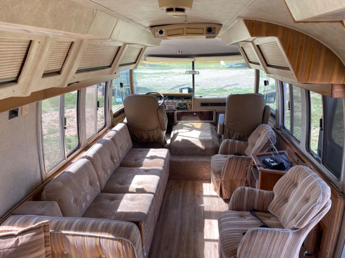 The design is surprisingly stylish, especially when you look at the rear end treatment. I’ve always loved this model with its gigantic wraparound rear glass sections, which creates a living room-like experience at the back of the motorhome. The listing notes the windows in this case are plexiglass, which make me wonder if the original glass panels were previously replaced. The bodywork appears to be in good condition overall, and even with its years of sitting outside, I don’t see too much evidence of sun damage. Mileage is said to be sitting at 14,000.