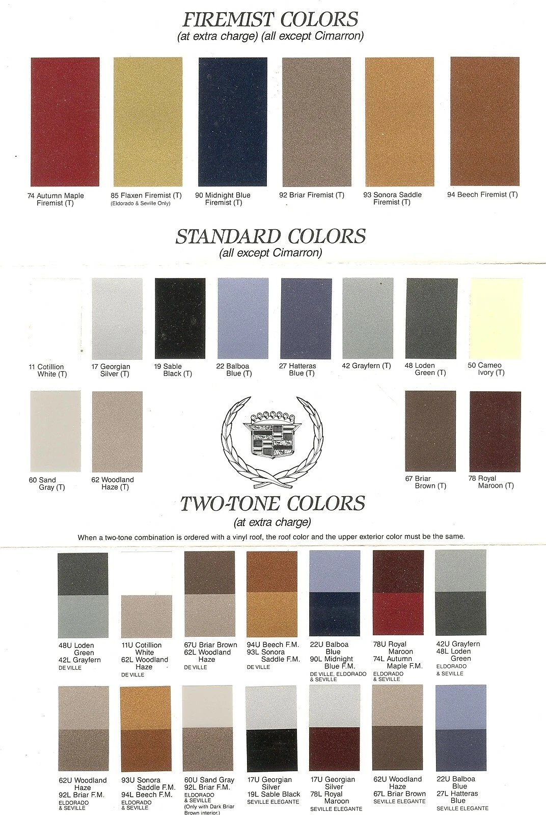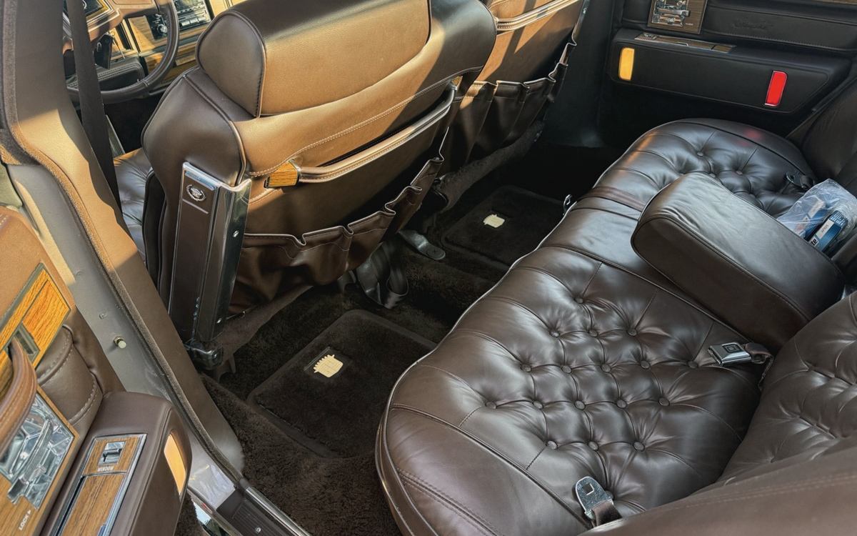 The seat color is, I believe, called Dark Briar Brown, according to the leather color chart on this person’s Flickr page, and it goes perfectly with what I believe is Woodland Haze paint and a Dark Briar Brown faux convertible top color, according to the listing on page 9 of this brochure for Sevilles with the “Full Cabriolet Roof” option. The back seat looks like new, as expected, and the seller lists the only real glitch inside or out as being that the front bumper filler material is showing a couple of cracks.