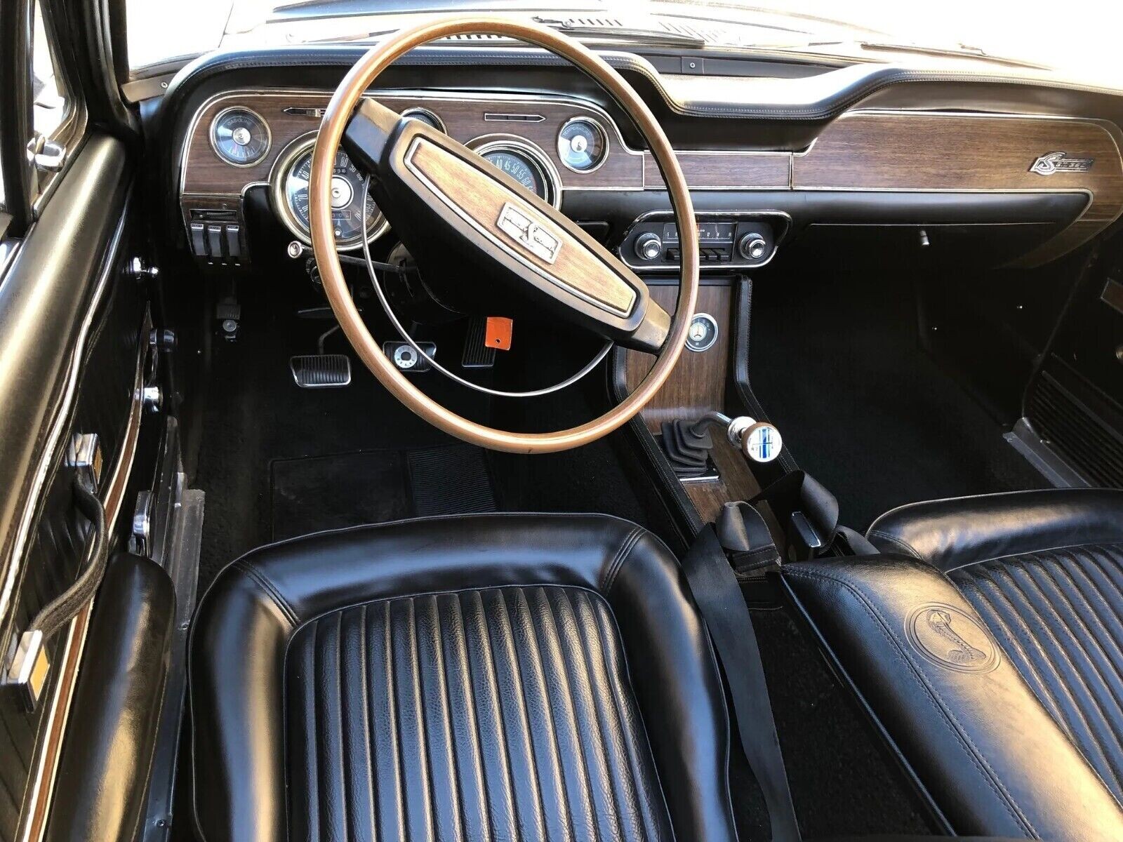 If this Shelby’s exterior makes a positive impression, its interior lifts it to a higher level. I have scrutinized the supplied images to find anything worthy of criticism, but nothing jumps out beyond what might be a slight warp in the dash pad above the glovebox. The Black vinyl upholstered surfaces are free from wear and distress, and the same is true of the carpet. The faux woodgrain trim has avoided the typical wear and deterioration, and the dash is excellent. The interior retains its unique features, like the rollbar and Cobra-embossed center console armrest, and there are no aftermarket additions. Factory options include air conditioning, a tilt-away wheel, and a pushbutton radio.