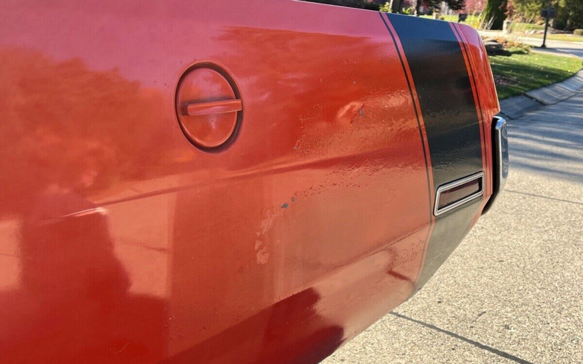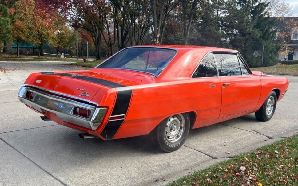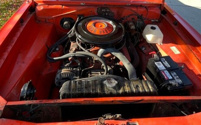 The exterior is finished in Hemi Orange and shows well except for the driver’s side quarter panel, just beneath the fuel fill. The finish is listed as mostly original though there have been some spot repairs performed. Some minor rust is detected in the lower fenders and quarters. The ChryCo rally wheels are referenced as reproductions, replacing slotted chrome rims that replaced the original deluxe wheel covers (according to the window sticker) that this Dart originally wore. The presentation, all-in-all, is pretty strong! There are no included images of the underside but we’re told that the floors are perfect with just a light coating of surface rust.