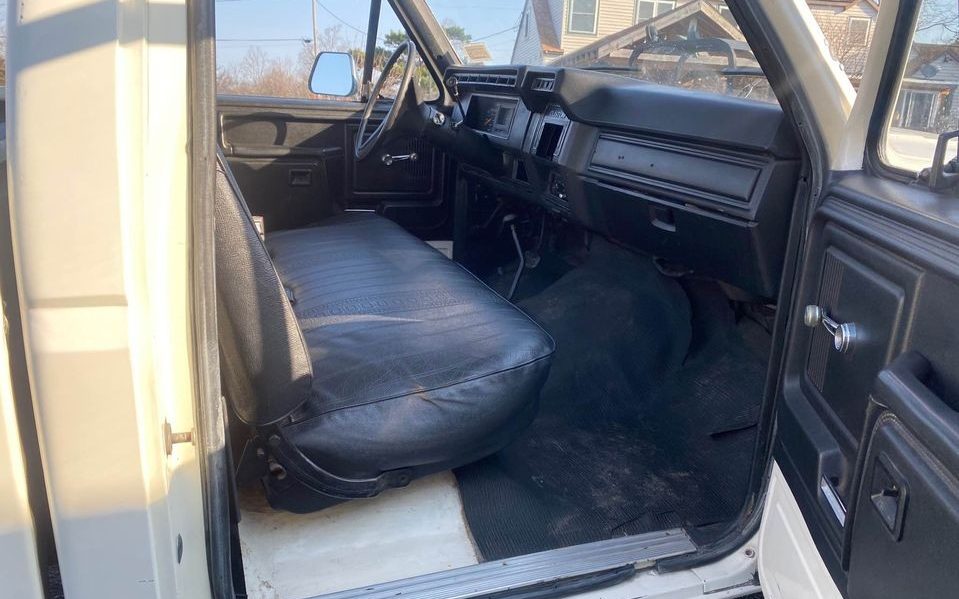 The interior has the same feel as the exterior, plain and all business. There is a basic black rubber floor mat and a simple black vinyl-covered bench seat in place – exactly what one would expect knowing this truck’s previous lot in life. This F-350 was built radioless and the radio slot has been modified for the now removed fire department equipment switch-gear – not a huge issue but one to consider if the next owner wishes to install a radio.