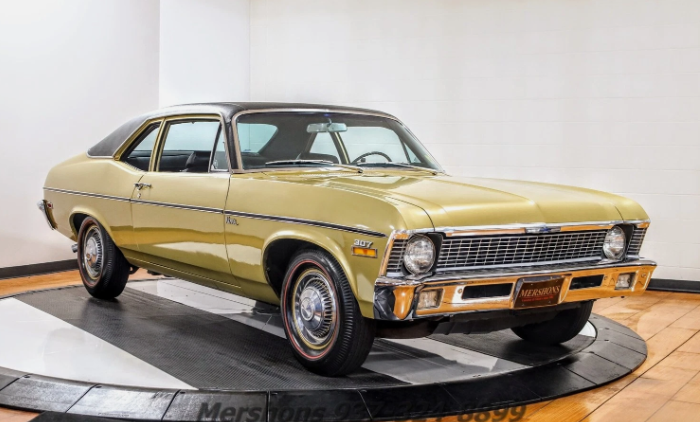 A buddy had a 350 Nova like this one, light green with dark green vinyl top. PS, PB, 350 Turbo trans. Posi rear with 3.08 gear. Took the vinyl off, repainted it dark green…headers, hi-rise, 600 Holley, 4.10 gears…killer car even with stock cam. Blast to drive although he was a little scary to ride with! Low end monster…that combo worked well with the auto trans. Looked great too with aluminum slots with wide tires on the rear.