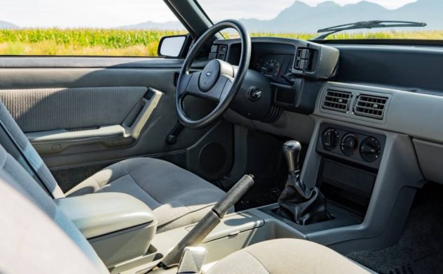 The typically all-gray ’80s interior with low-back cloth bucket seats didn’t threaten Corvette or Ferrari for sports-car styling, but the angled five-speed shifter and thick vinyl steering wheel offer driver-centric controls, and this no-nonsense platform enjoys a rabid aftermarket following. The compact OHV 5.0L (302 cid) Windsor small block is easier and cheaper to service than later Modular and Coyote V8s. Thanks to StangBangers for the Ford brochure and details.